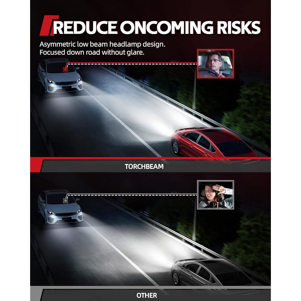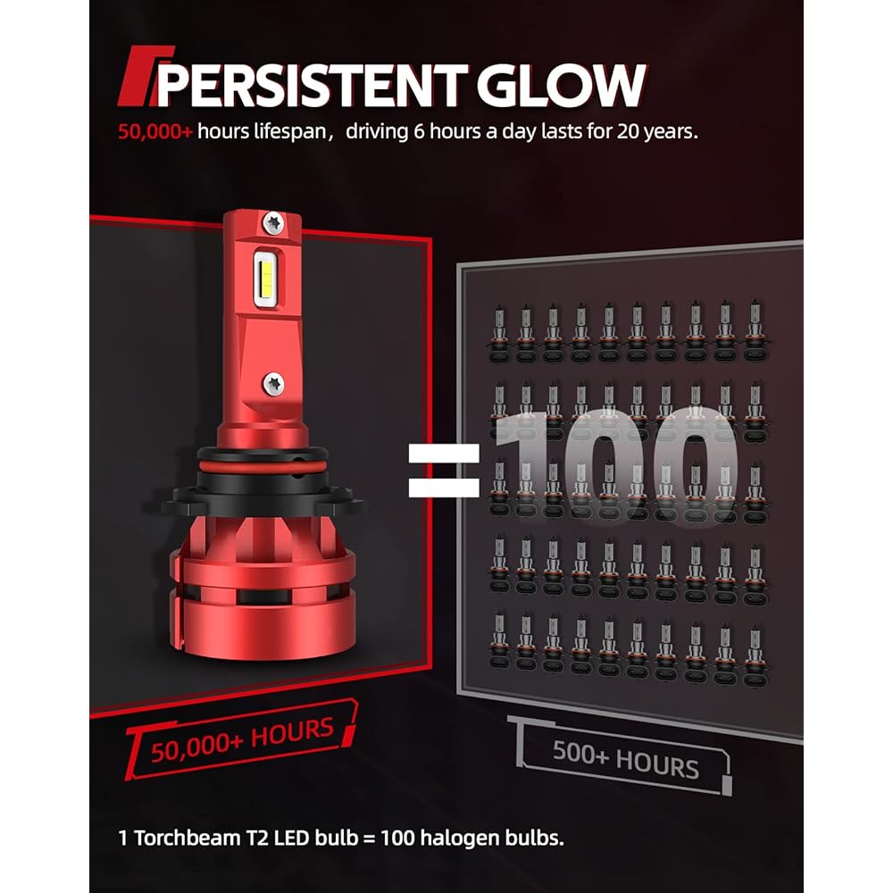 Improved visibility: The output of T2 type bulbs is 400% brighter than regular bulbs due to advanced LED chips. Drive safely with bright vision with 6500K daylight optics. Easy to install: Durable, non-polar plug-and-play design is compact and typically installs in just minutes. No tools required. Simply plug directly into your car's housing and connect. No Glare: Torchbeam's T2 9005 9006 LED headlight bulbs are much brighter than regular halogen bulbs, but have a beam pattern that reduces glare from oncoming traffic. Efficient Cooling: High-tech turbo fan operating at 10,000RPM provides efficient and effective heat dissipation. Compared to light bulbs without fans, you can get up to 50% more cooling effect. Long Lifespan: T2 9005 9006 LED headlight bulbs have been rigorously tested to provide an incredible long lifespan of over 50,000 hours of lighting time.