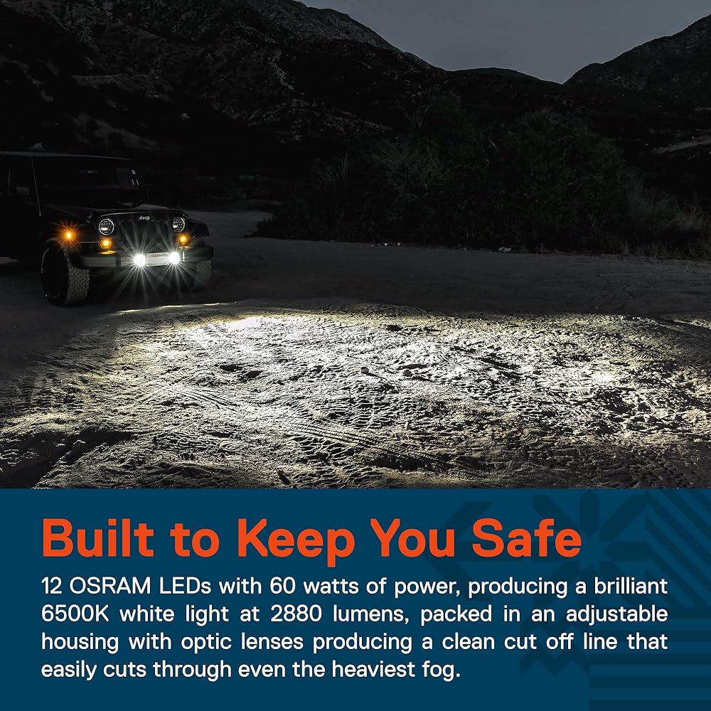 DESIGNED TO PERFORM - Just like your ride, our lights are engineered to perform even under the worst conditions. Built to take a beating with an IP67 waterproof rating, impact-resistant polycarbonate lens, and durable die-cast aluminum body. Designed to keep you safe - 12 OSRAM LEDs with 60 watts of power produce a brilliant 6500K white light at 2880 lumens, packaged in an adjustable housing that easily cuts through even the heaviest fog. BUILT TO LAST - Excess heat shortens the lifespan of LEDs. That's why our lights are designed with vertical heat sinks parallel to the airflow to maximize heat dissipation and keep your lights bright for years. No sweat installation required - No drilling, cutting, splicing, or adjusting required. Our LED fog lights are exact retrofit replacements for your factory lights. The included wiring adapter snaps directly into the stock connector. Compatible Models: 2007-2016 Jeep Wrangler Unlimited JK 4-Door, 2007-2016 Jeep Wrangler JK 2-Door, 2004-2006 Jeep Wrangler LJ Unlimited, 1997-2006 Jeep Wrangler TJ, 2007-2014 Jeep Wrangler, 2009-2012 Dodge Journey, 2 005-2008 Dodge Magnum 2006-2010 PT Cruiser, 2011-2012 Jeep Grand Cherokee 2011-2012 Dodge Charger 2005 Chrysler 300