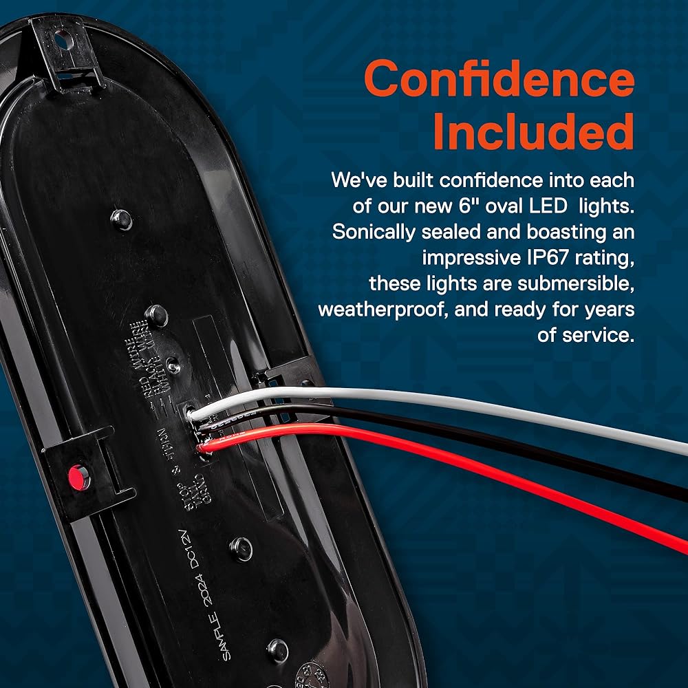 Durability - Unlike many other lights on the market today, our surface mount LED lights comply with DOT and SAE standards as set forth in FMVSS-108. This commitment to quality means every light we install is safe, compliant, and legal. CONFIDENT - Be confident in your 6 inch oval LED light. Acoustically sealed and boasting an impressive IP67 rating, these lights are submersible, weatherproof, and will last for years. Visible - Taillights have one job: to keep you visible and safe. It depends on how bright it is. Equipped with 10 high brightness LEDs and light diffusing lenses, our oval trailer lights are very good at their job. EASY AND FAST - Upgrading your old tail lights? Lighting up a new build? These surface mount lights simplify the installation process by eliminating the need for large oval holes. All you need is one small hole and four self-tapping screws. MULTI-FUNCTION - Our amber and red lights offer two intensity levels to act as a tail light or turn/brake light. White Light provides a simple, single intensity, super bright reverse/backup light.
