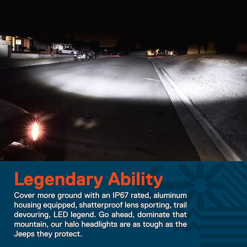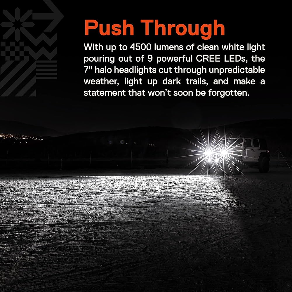 Define your style - We've redrawn the line between style and function. Black LED halo headlights with white DRLs and amber turn signals enhance the look of your rig without sacrificing quality. Who says you can't have it all? Push Through - Up to 4500 lumens of clean white light pour from 9 powerful CREE LEDs, 7-inch halo headlights cut through unpredictable weather Light up the dark trails and make a statement you won't soon forget. LEGENDARY CAPABILITIES - Equipped with an IP67 rated aluminum housing, shatterproof lens sports trail diverging, and covers more ground with the LED Legend. Now it's time to rule the mountain. Our halo headlights are as tough as their protective rigs. Smart Choice - Our headlights feature an integrated CAN bus chip to eliminate flicker, H4/H13 adapters to simplify installation, and a clean cut-off line to illuminate the road, not other drivers . US Department of Transportation Compliant - Push the limits and follow the law. With light kits from the Online LED Store, you can do both. Hit the road or trail with the confidence you get from a fully legal, DOT compliant headlight set.