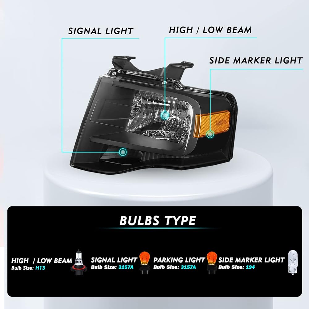 [Suitable Model] Compatible with headlight assembly 2007-2014 Ford Expedition. Not compatible with factory xenon HID headlight models. Compatible with factory halogen headlight models only. Light bulb not included. High Beam/Low Beam: H13 Signal Light: 3157A Parking Light: 3157A Side Marker Light: 194 [Premium Design] Special surface coating will not scratch the lens, compliant with DOT & SAE regulations. Plug and play operation, direct original equipment replacement for stock units; fully sealed, waterproof, dustproof and corrosion resistant. 【Higher Visibility & Safer Driving】This headlight provides increased brightness, allowing you to see the road clearly even at night or in extreme weather. Improved visibility can help you avoid traffic accidents and make driving safer. [Replacement] OEM part number: 7L1Z13008BB, 7L1Z13008AB, part link number: FO2503226, FO2502226. 【Warranty】This headlight assembly comes with a 30-day hassle-free return and 1-year unlimited replacement warranty. If you don't like it, return it for a full refund. All we want is for you to love TUSDAR products.