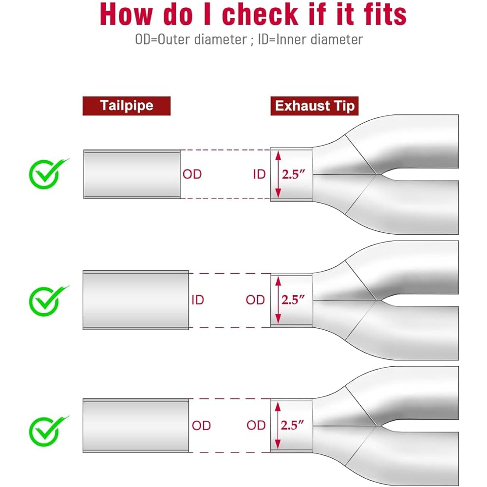 Upower Dual Exhaust Tip 304 Polished Stainless Chrome for ID 2.5"/OD: 3.5"/Length: 9.5". 2. Exhaust Tip Features: **Inlet Diameter: 2.5" **Outlet diameter: 3.5 inches. **Total length: 9.5 inches. **Installation: Welding. **Style: Double Wall Slant - Angled Cut. **Material: 304 stainless steel. 3. Exhaust Tip Description: **Features corrosion resistance to alkaline solutions and most organic and inorganic acids. **Repeated polishing process, bright like a mirror, highlighting the noble quality. 4.Package Content: 1 x Stainless Steel Dual Exhaust Tip