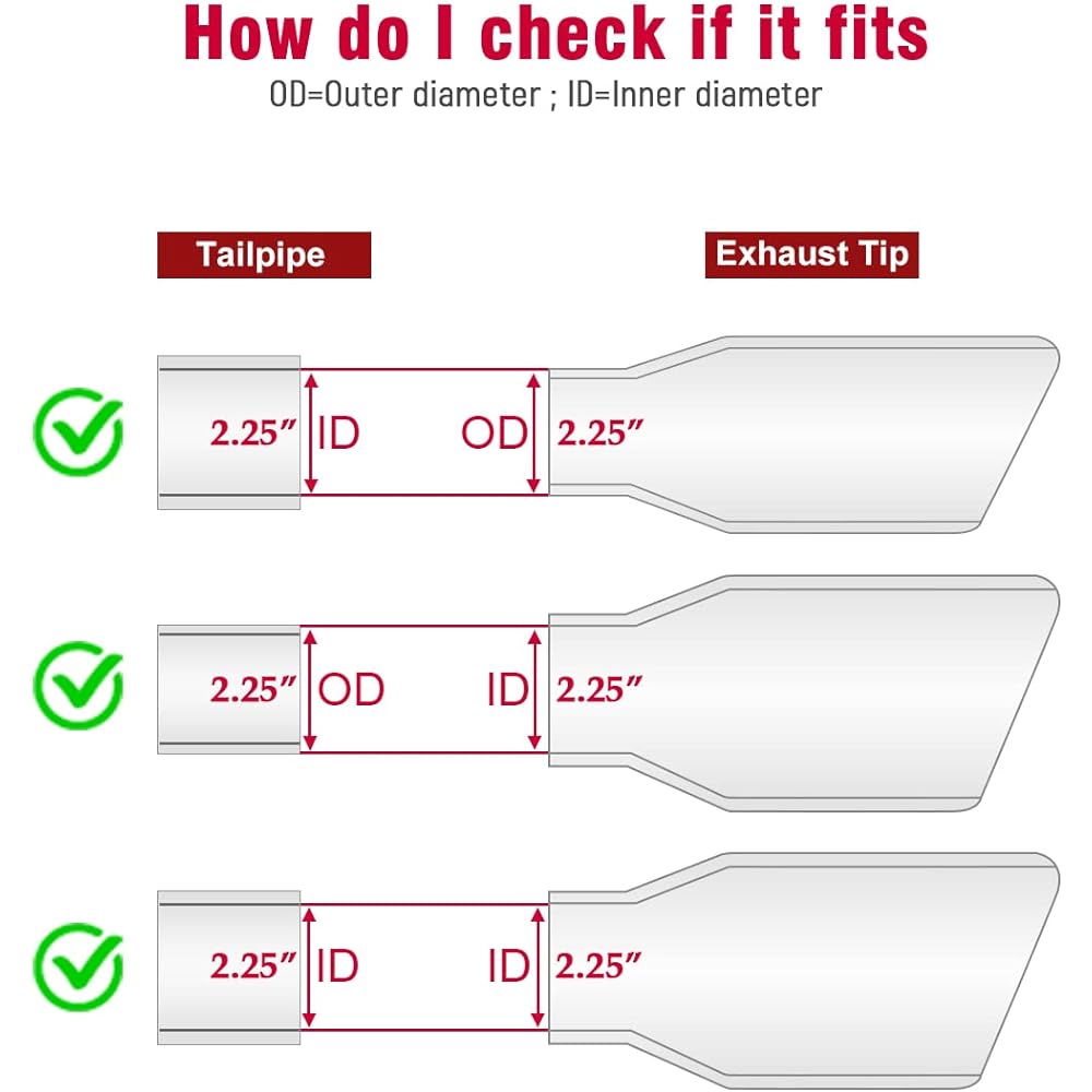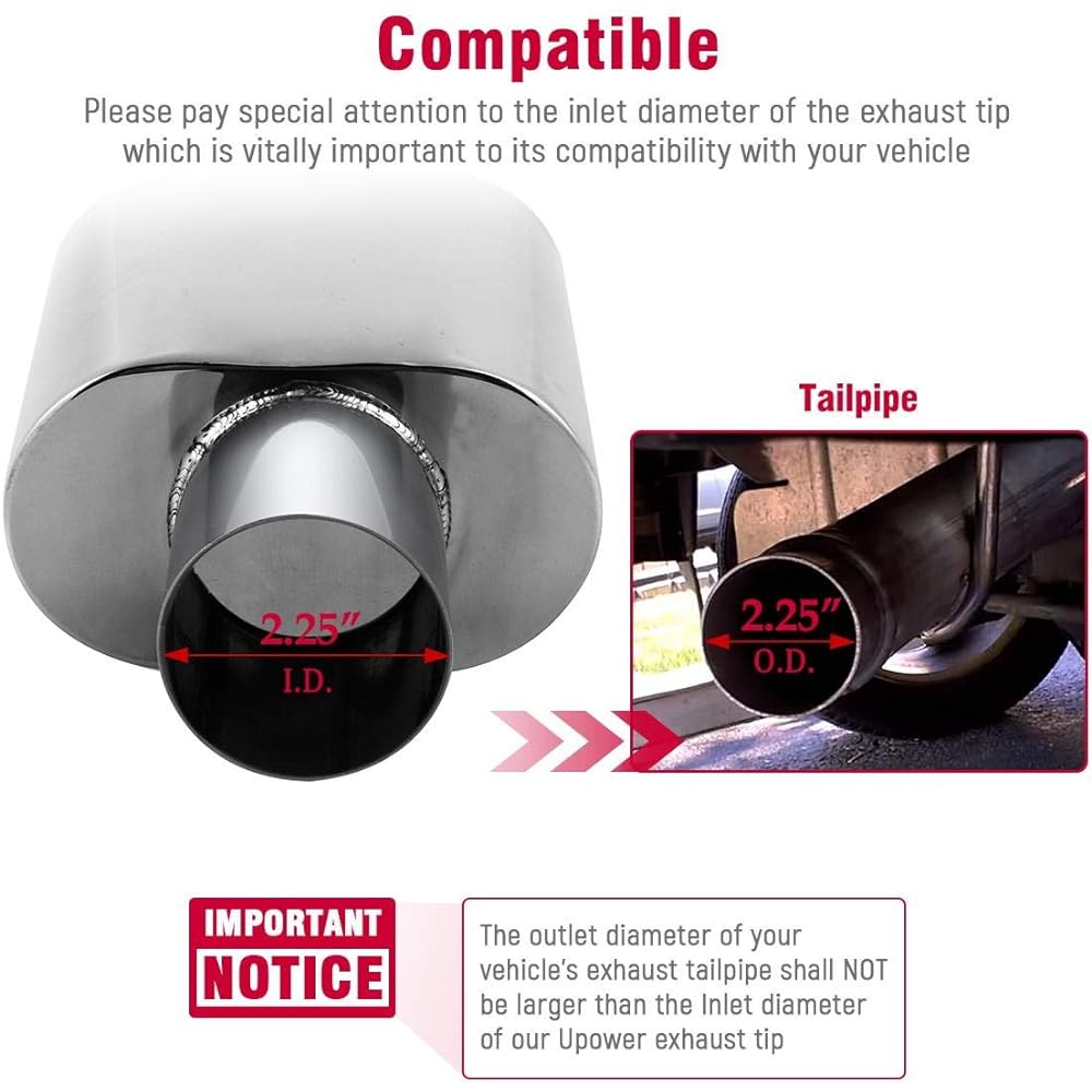 ID: 2.25 inches. Outer diameter: 5.5" x 3". Length: 9 inches. Angled roll oval. Welded installation and square single angle cut - rolled edge design Material: Made of high quality stainless steel, very strong corrosion resistance and will not rust. 1 pack; Professional installation is highly recommended; Instructions not included. FITMENT: To ensure proper fit, please ensure the diameter of the exhaust port is 2.25 (2 1/4) inches.