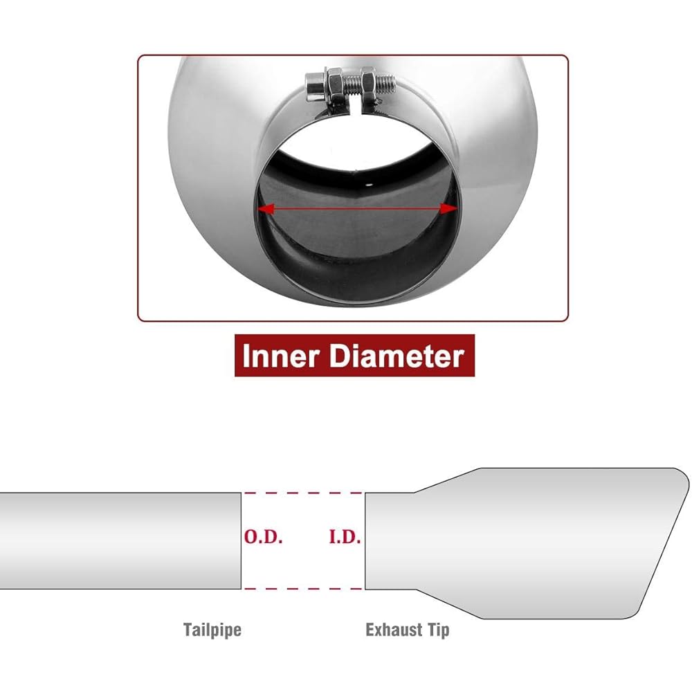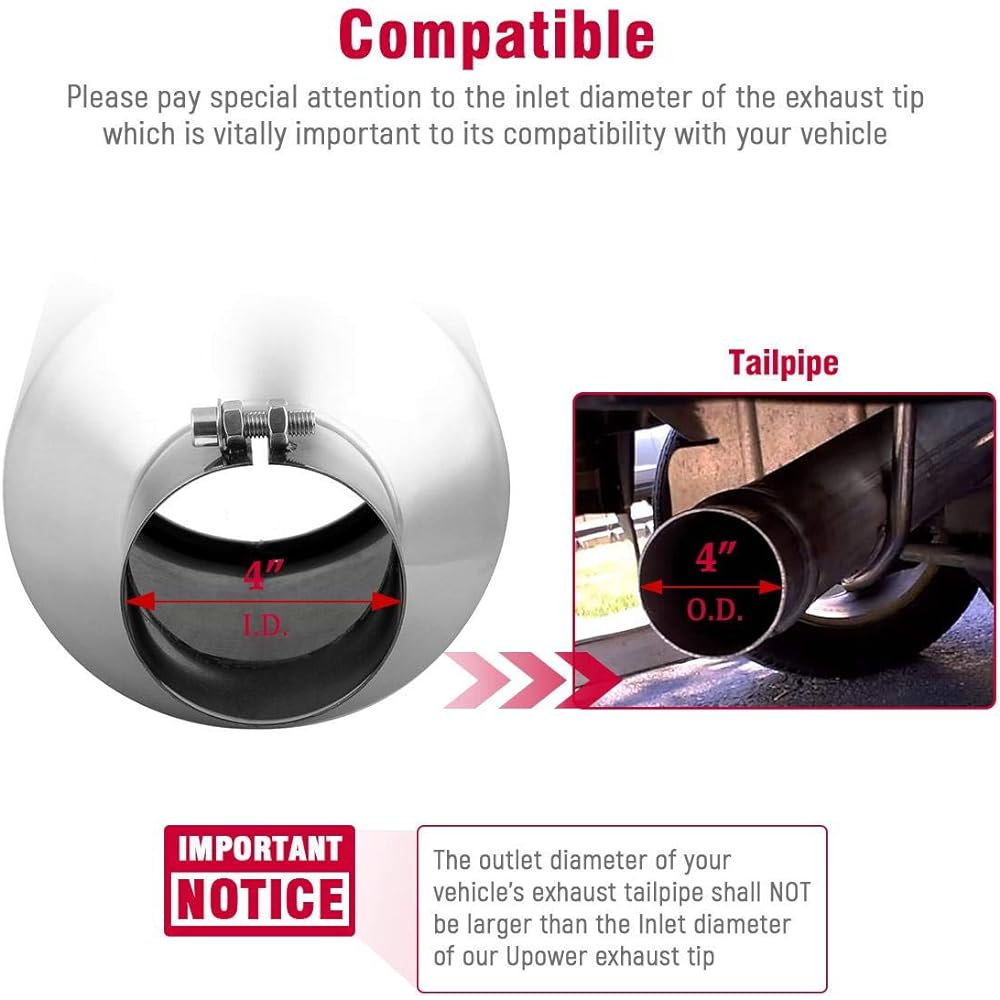 1. Fitment: Universal exhaust tip, fits 4 inch inlet pipe. 2. Exhaust Tip Features: *Size: 4" Inlet - 6" Outlet - 15" Length. *45 degree single angle cut - rolled edge design. *Installation: Bolt on, easy to install. *high quality. *Material: Stainless steel with very strong corrosion resistance. Will not rust. 3. Exhaust Tip Description: *Features corrosion resistance to alkaline solutions and most organic and inorganic acids. *Repeated polishing process, bright like a mirror, highlighting the noble quality. *Perfectly decorate your car exhaust pipe. 4. Package Content: 1 x Stainless Steel Exhaust Vent.