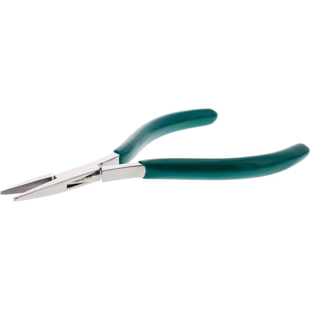 Made of stainless steel with dark green PVC grips. Flat/half round bending pliers, 5 inches long, made in Germany.