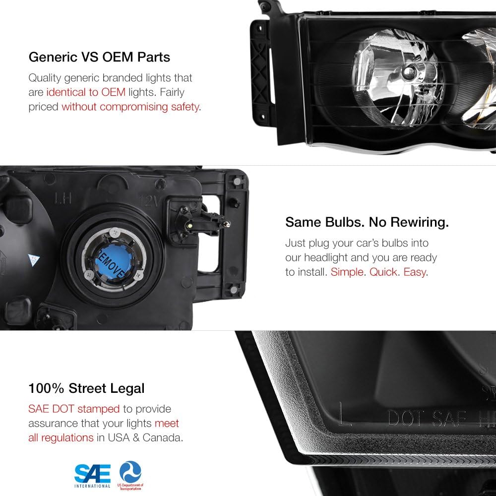 2002 2003 2004 2005 Dodge RAM 15002003 2004 2005 Dodge RAM 2500 | 3500HEMI | Laramie | Rumble | SLT | SRT-10 | ST | WSStandard Cab | Quad Cab|Mega Cab|Mega Cab|Dodge Ram Not compatible with van models. Product Features Infinity Black Edition crystal clear lenses match the matte black housing. Generic V.S. OEM parts quality generic brand lights are identical to OEM lights. Affordable without compromising safety. Same light bulb. No rewiring required. Just plug your car's light bulb into your headlight and you're ready to install. Simple, quick, easy. 3 layers of protection. 3 layer coating. Every day, it relieves debris and weathering. 100% street legal. SAE DOT approved. U.S. Department of Transportation and Society of Automotive Engineers certified product. Our products meet all US and Canadian regulatory standards.