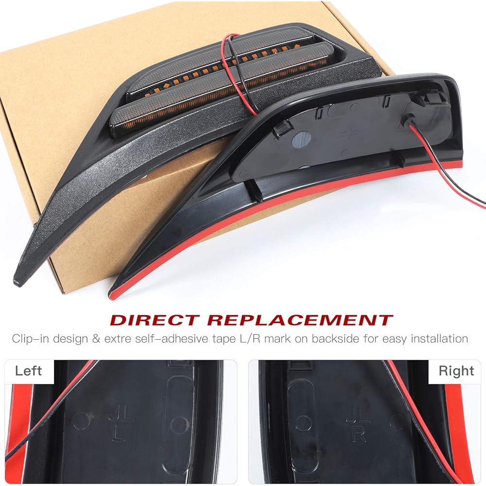 Model: 2018-2022 Jeep Wrangler JL JLU 2-Door & Unlimited 4-Door (Sport, Sahara, Freedom, Rubicon) For 2018-2020 Jeep Gladiator JT. The inside has an amber LED light and a smoked lens. Black ABS housing. Simply splice to your existing light wires and connect the two wire lights directly to your existing light wires (connect the red wire to positive and the black wire to negative). IP67 waterproof, sealed cover prevents rain from leaking into the light. Safety and performance are ensured. Give your Wrangler a dazzling look and exceptional lighting with sidelights. Package Contents: 2 x Fender Side Marker Lights.