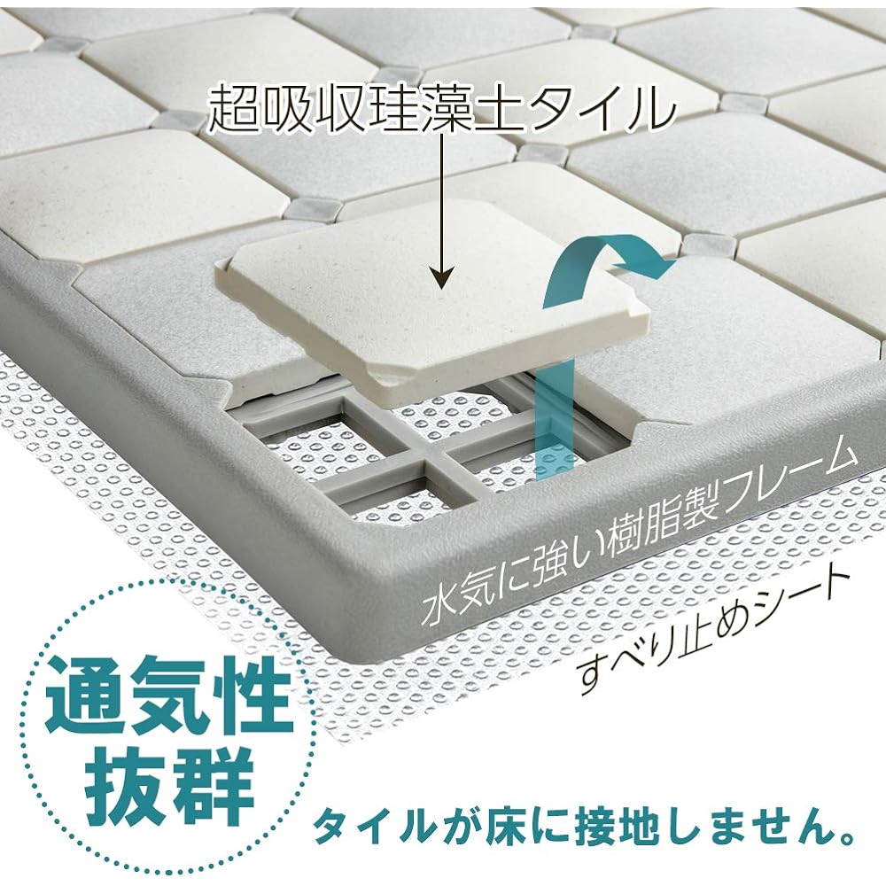 Size: Approximately 52.6 x 40.1 x 2.2 cm Tile: Diatomaceous earth, Frame/Fixing clip: Polypropylene (heat resistant temperature 120 degrees), Anti-slip sheet: EVA resin (heat resistant temperature 70 degrees) Country of production: China *Does not contain asbestos .