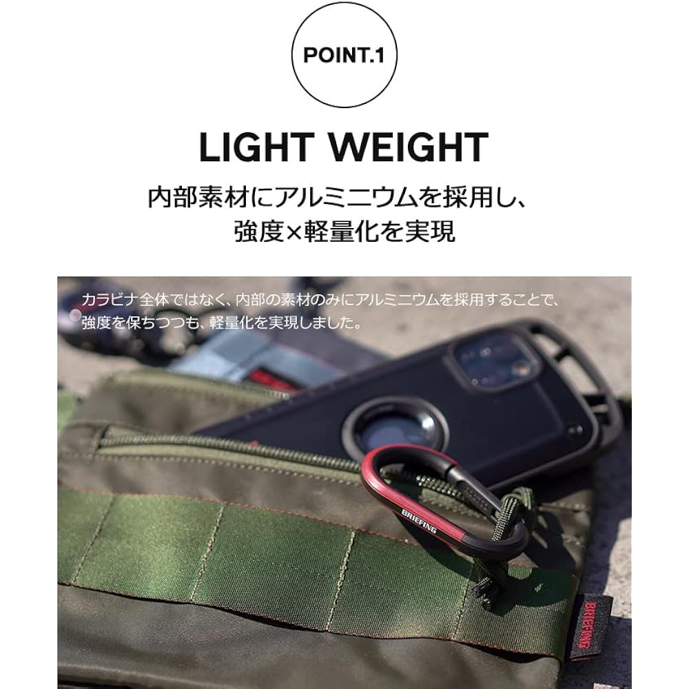 A hybrid carabiner made of three layers of different materials with the BRIEFING logo and a bright bi-color design. The BRID carabiner has a three-layer structure that combines aluminum, TPU, and ABS resin. The interior is made of aluminum, making it lightweight yet strong enough to be used as a carabiner. TPU covering the aluminum parts reduces scratches and damage to things that come into contact with it. Because it is a simple carabiner, it has a stylish design that is perfect for outdoor scenes with the logo and bicolor accents. Caution (Disclaimer) > Please read this product is not intended for mountain climbing.