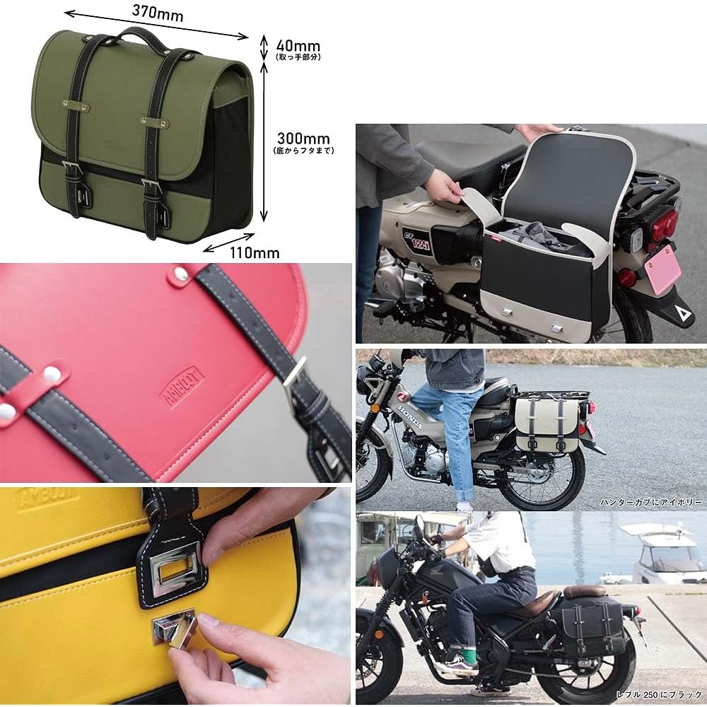 Product name AMBOOT Side bag Saddle bag Product number AB-SB01 Size W370 x H300 x D110 (mm) Weight approximately 1.4kg Material: PVC leather/polyester Rain cover: Polyester Capacity approximately 10L Installation method ●To install this product , commercially available bag support is required. Secure it with the two attachment belts on the top and the two attachment cords on the bottom. Inserting the bag support into the black strip in the center of the back will make it more stable. *It may not be possible to install the bag support with a special shape. *Please install it on the left side to prevent contact with the muffler. Product Features - A side bag with a wide variety of colors that can be selected to match the body color of your motorcycle - Comes with a handle for convenient carrying - Two convenient inner pockets - Comes with a rain cover that is great for rainy days - Approximately 10 liters - Compact design - Easy to open and close with twist fittings like a school bag Accessories - Main unit - Mounting belts (2 pieces) - Mounting cords (2 pieces) - Rain cover Note - To install this product, use a commercially available bag support. is required. ●When installing, be careful not to let the excess part of the installation belt or installation cord get caught up in the tire. ●Please do not put baggage over 5kg. ●Please install it in a position that will not interfere with driving. ●This product is a sewn product. It is not completely waterproof. If rain is predicted, please put your belongings in a waterproof bag before storing them in the bag. ●Even if you attach a rain cover, rain may still get in. ●Before riding, be sure to check that each part has not come off. Especially check that the mounting part is not loose. If you leave the vehicle unattended while driving, it is very dangerous as the bag or belt may get caught in the wheels and cause damage to the vehicle following you. ●Do not scratch the product with sharp objects. ●Although it is a general-purpose product, it may not be possible to install it depending on the car model and specifications. ●Please note that slight discoloration and fading is unavoidable even with normal use due to ultraviolet rays and lighting. ●If you notice any deterioration of parts or fabric due to aging, please replace with a new product. ●Please refrain from swinging the product around by the belt or handle. Doing so may cause damage. ●Please be careful not to get gasoline or oil on it. This may cause deterioration of the fabric and metal fittings. ●Color may transfer if it comes in close contact with other materials. ●Please use with caution as the product may melt if it comes into contact with high temperature parts such as the engine or muffler. ●Storing or parking both the main bag and rain cover in a place exposed to rain or direct sunlight may cause deterioration such as fading or deformation. Also, please avoid leaving it on for a long period of time. ●There may be slight color differences depending on the lot. Care Instructions ●If it gets dirty, wipe it with water immediately, wipe it with a dry cloth, and then dry it. ●Please wipe off dust and dirt regularly as it may cause discoloration or deterioration. ●Store in a place with low humidity and out of direct sunlight.