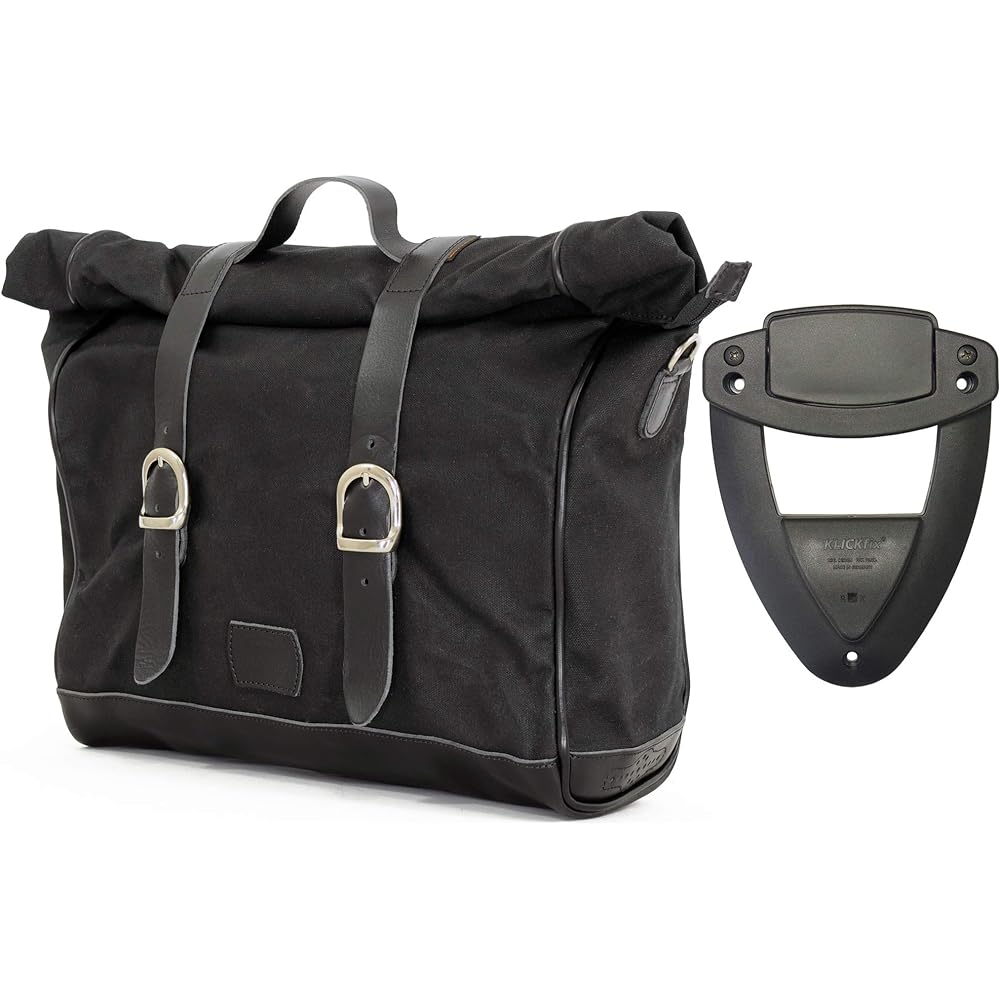 Low position specification approximately 5cm lower than standard (limited to compatible models) Size: W40 x H46/32 x D14 cm Capacity: 18L Color: Black Material Outer: waxed cotton/cowhide leather Inner: polyester One-touch mounting system / KLICKfix( Click-Fix) adapter included. Vehicle-specific "CLICK-ON bracket" is required for installation. Accessories: key