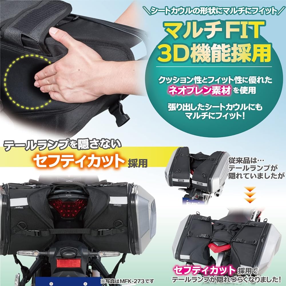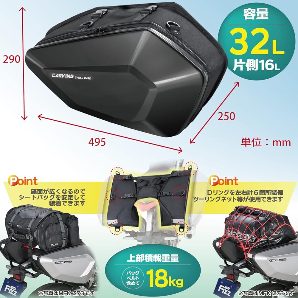 TANAX 2020 new product●Carving shell case★Introducing a new side bag that can be attached to sports type vehicles, which was difficult to attach until now! [Full of features that allow you to go camping touring on a sports bike] - The safety cut mechanism does not hide the tail lamp even on short-type rear cowl cars. - By using a connection belt, there is no need to pull the fixed belt backwards.・By installing this bag, you can securely attach the seat bag even in narrow rear seats.・Features Compatible with swing arm installation type rear fender vehicles! Safety cut semi-hard design Waterproof inner pouch The secret to secure installation Easy base Slim Convenient to carry Flat top surface Multi-fit D ring for loading reflector Neat design around the rear ---------------- Body size: 290 (H) x 495 (W) x 250 (D) mm (one side) Package: 300 (H) x 500 (W) x 550 (D) mm Body weight: 2.9 kg (1.45 kg on one side) Material: Polycarbonate, 1680D Polyester contents: Main body (left and right) x 1, inner pouch right x 1 (MP-332), inner pouch left x 1 (MP-333), Easy base slim x 1 (MP-334), connection belt x 1 (MP- 335), fixed belt x 2 (MP-123T) Capacity: 32 liters (16 liters on each side)