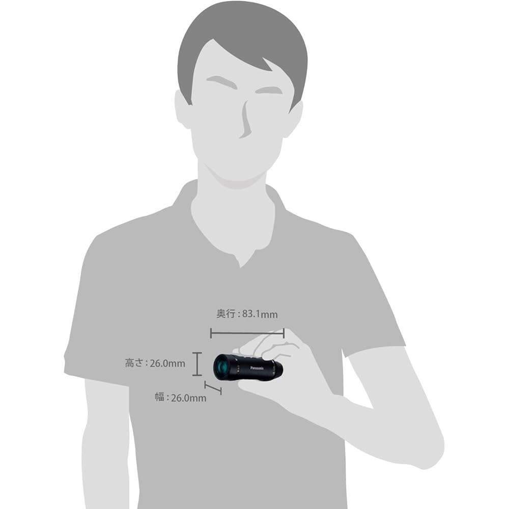 External dimensions: Height 2.6 x Width 2.6 x Depth 8.31cm Body weight/Weight when in use: Approx. 45g/Approx. 45g (including microSD card) Image sensor: 1/3 type MOS solid-state image sensor Number of effective pixels Video: 287 10,000/Still image: 2,660,000 Waterproof/dustproof compliance standard: IP68 Waterproof performance guaranteed Water depth/Waterproof performance guaranteed immersion time: 1.5m/30 minutes Shock resistance: 1.5m (MIL-STD 810F Method 516.5-Shock compliant) Power supply: Input: DC 5V 1A/Li-ion rechargeable battery: DC 3.7V/480mAh Power consumption: Recording: Built-in battery 1.3W, Charging: 2.1W when using PC, Power off: 0.001W Recording/compression method (video): MPEG-4 AVC/H.264 Increase the number of items displayed
