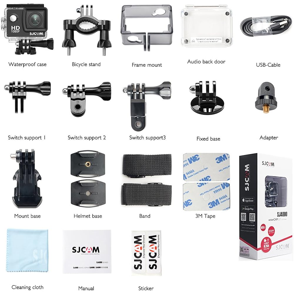 1 x SJ4000 camera: 1 x waterproof case, 1 x quick release buckle, 1 x housing back door with holes, 1 x handlebar mount, 1 x curved adhesive mount, 1 x flat adhesive mount, 3-way pivot arm mount 3M adhesive 2x tape, 1x frame mount, 1x quick release clip for frame, 1x vertical quick release J-hook buckle, 1x universal 1/4 inch camera tripod mount, 1x tripod mount adapter, 1x bandage set, stainless steel safety iron Tether x 1 Nylon girth x 4, cleaning cloth x 1, USB cable x 1, AC adapter x 1, 900mAh lithium-ion battery x 1, multilingual manual x 1, SJCAM sticker x 2 *For product specifications and included items, Some details may change without notice. Please note.