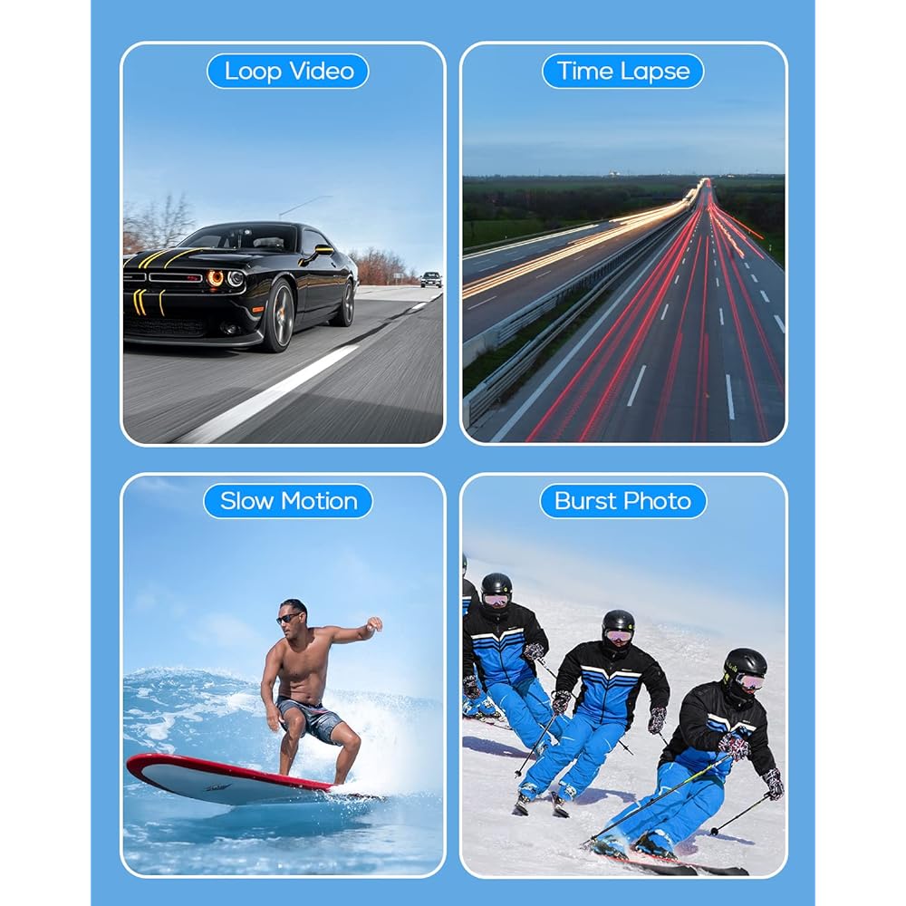 🎬【4K UHD Video & 20MP Photos】WOLFANG GA100 vlog camera has 4K video resolution with 4K 30fps, 2.7K 30fps, 1080P 60fps, 1080P 30fps, 720P 120fps video options, allowing you to see every detail of your adventures. You can capture it. Photo resolution has 20MP/16MP/12MP/8MP options, allowing you to clearly freeze beautiful moments. 🏊【40m Waterproof Camera】The waterproof housing of GA100 underwater camera is sturdy and durable. With the waterproof case attached, you can easily explore the amazing 40 meters underwater world and enjoy the fun of water sports such as swimming, surfing, sailing, snorkeling and diving. It can also be used in rainy and snowy weather. 🎤【Dual Microphone & Rich Accessories】GA100 helmet camera comes with an external noise canceling microphone, which can capture clearer audio even in noisy environments. The included multi-functional mounting accessories can meet the needs of various usage scenes, such as bicycle, motorbike, horseback riding, snorkeling, diving, skiing, etc. No need to purchase additional accessories. 🚴【EIS Image Stabilizer & Multi-Mode】GA100 gopro is equipped with EIS image stabilization, which greatly improves video stability and smoothness, making it easier to capture great sports moments. GA100 gopro has various recording modes, including selfie, continuous recording, timing recording, time-lapse recording, loop recording, slow motion, and auto mode. 🏂【WIFI sharing, as DVR or webcam】Wearable camera GA100 can be connected to your smartphone via "IBK CAM" app. You can send live videos and photos to social platforms, and control your camera remotely from your smartphone. It can be used as a webcam for video calls, e-learning, and meetings, and as a car recorder to record driving conditions.
