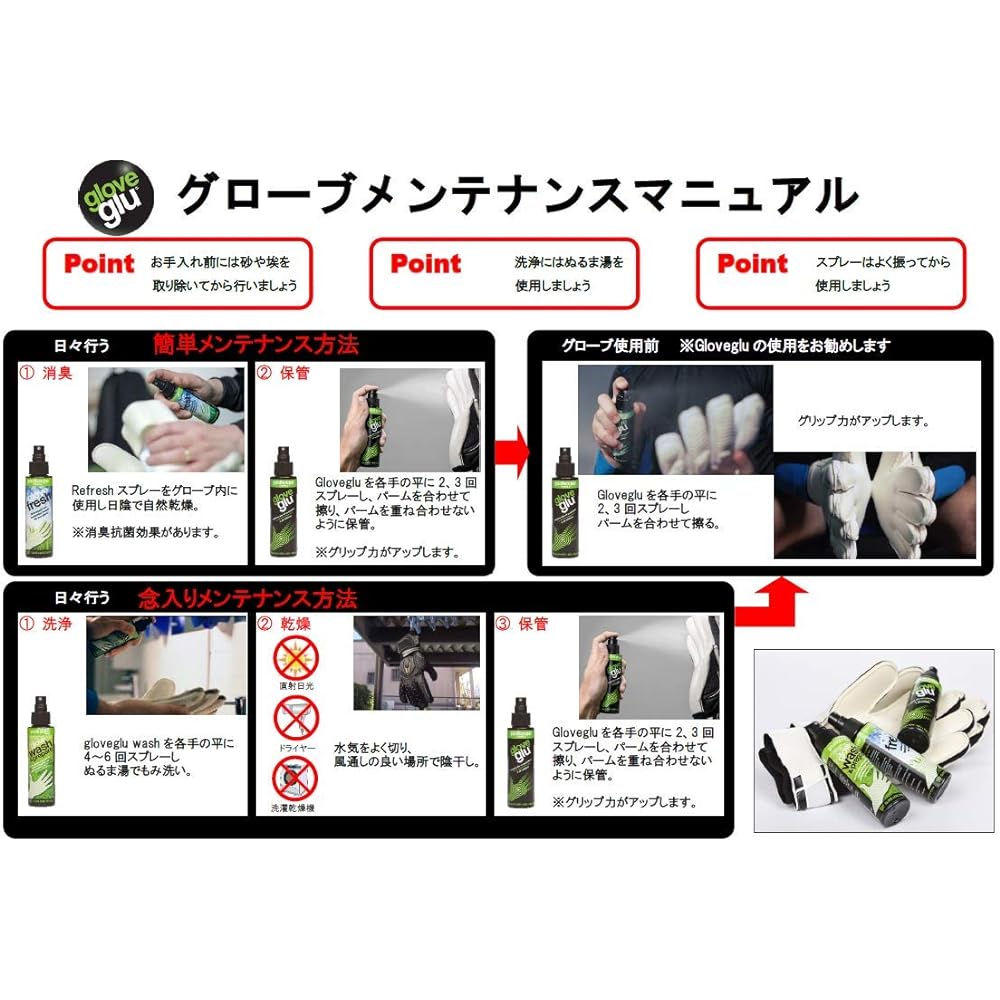 [Product Name] Gloveglu MEGAgrip Formula [Capacity] 120ml [Features] Megagrip has 25% more adhesive strength than glove Goalkeeper Formula. Restores the grip of worn-out gloves. ■Gloveglu has a unique formulation that increases the grip of goalkeeper gloves. ■Can be used before or during a game, and is effective regardless of the environment, whether wet or dry. Compatible with any type of GK glove. ■Compatible with any goalkeeper gloves, just spray 2 or 3 times before practice or game to improve grip. ■Safe even on rainy days when you are concerned about grip strength! [How to use] 1 Shake the bottle lightly. 2 Apply it on the palm of the GK glove 2 or 3 times. 3 Massage thoroughly with both hands. 4 Let it dry a little and you can use it again with excellent grip! Caution) Never spray on anything other than gloves. If it comes into contact with your eyes, immediately rinse with water and consult a doctor if you notice any abnormalities. Please note that we cannot be held responsible for any abnormalities that occur if the product is not used normally. Since soil may adhere to clay grounds, we recommend using artificial turf or turf as much as possible.