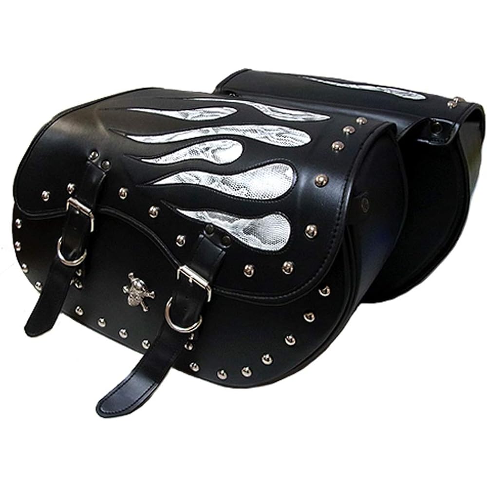 A durable and unique saddle bag carefully handmade by skilled craftsmen. A basic size double bag that is easy to use. The simple black color is accented with silver studs and skull conchos.
