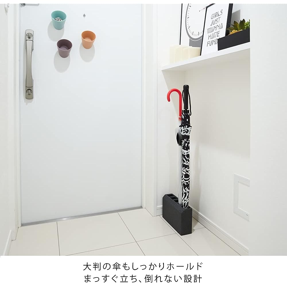 A slim umbrella stand with no more security. By blending natural stone powder with polyester resin in a 50/50 ratio, it weighs 4.3kg and can firmly hold five large umbrellas without tipping over. The carefully designed three-tiered hole shape allows you to store both long umbrellas and small vinyl umbrellas in an upright position.