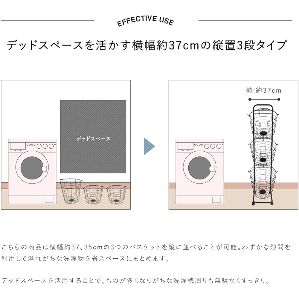 This is a 3-tier vertical laundry basket with casters that allows you to use your laundry space without wasting space. Three baskets are removable. It is removable so you can easily put in and take out laundry. It also has a handle, so it's easy to carry. You can use it conveniently when you go to dry your laundry or take it in. Material: Steel Frame size (cm): Height approx. 123 x Width 27 x Depth 36 cm / Basket size (cm): Small / Height 37 x Width 35 x Depth 27 cm Large / Height 37 x Width 37 x Depth 32 cm Weight : Approx. 4.3kg / Load capacity: 30kg (15kg per basket *If installed on a frame, 15kg will not fit into all three baskets at the same time) / Capacity: Small 15L per basket, Large 25L