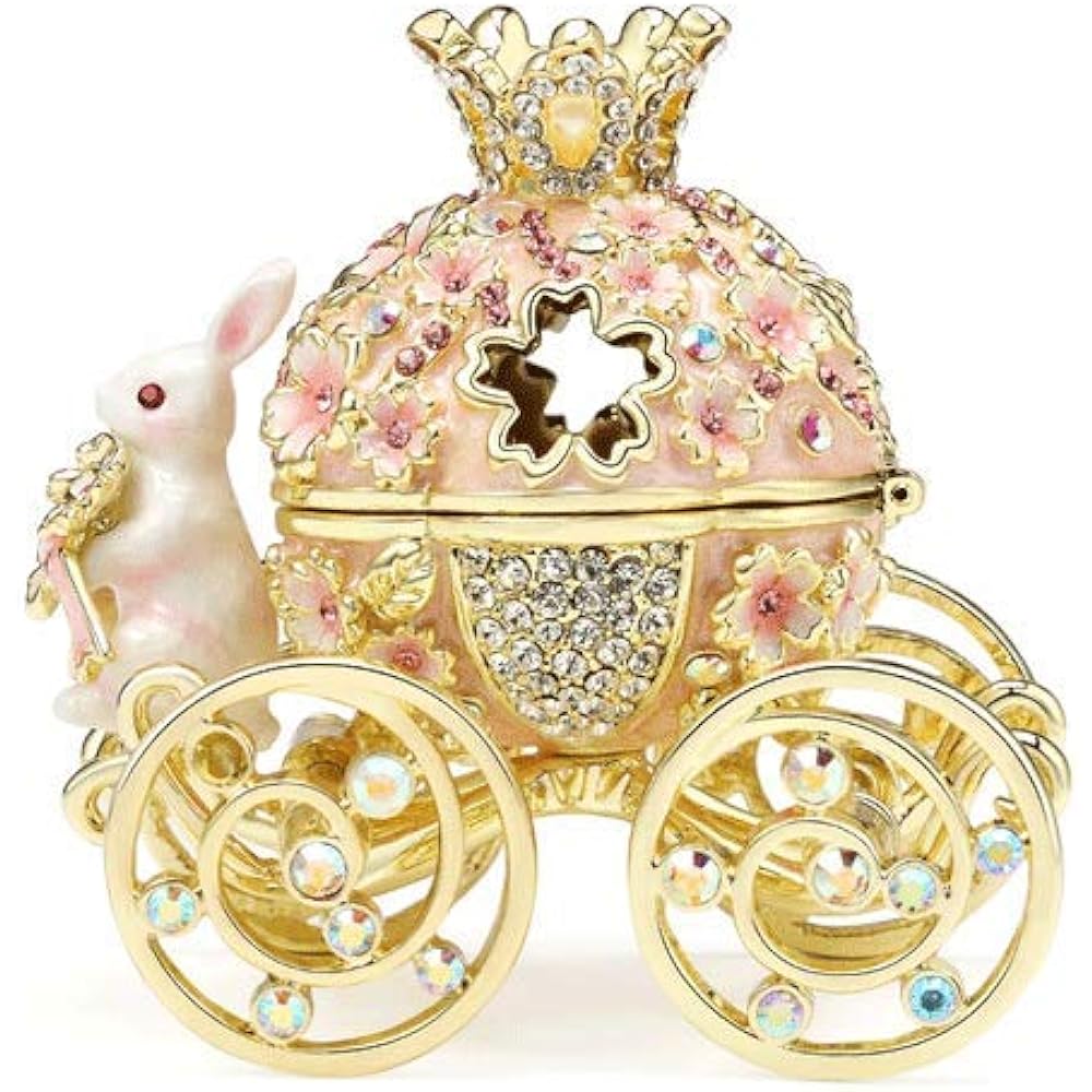 A cherry blossom carriage jewelry box that will bring you spring. A lot of cherry blossoms and crystals are used in the wagon part to create a luxurious atmosphere. Red crystal glass shines in the eyes of the white rabbit holding a ribbon bouquet of cherry blossoms. The wheels with sparkling crystals are exquisitely crafted and rotate properly. It's a nice interior decoration to display as is, but you can also store accessories inside and use it as a small accessory case.