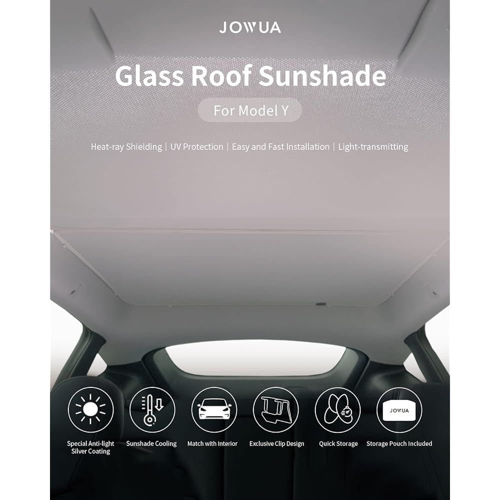 Designed for Tesla Model Y: Designed for Tesla Model Y Double-sided and high-density mesh fabric: Lightweight mesh fabric helps reduce heat transfer into the vehicle interior by blocking most solar heat loads Masu. According to SGS international lab test results, the cooling effect is up to 2.3 times more compared to other brands of sunshades. EXCLUSIVE CLIP DESIGN: Jowua's specially designed sunshade clips make it easy to install and remove. Easy folding and storage: The awning can be folded into a small shape and stored in a convenient pouch. This pouch also fits perfectly into the Jowua rear well liner.