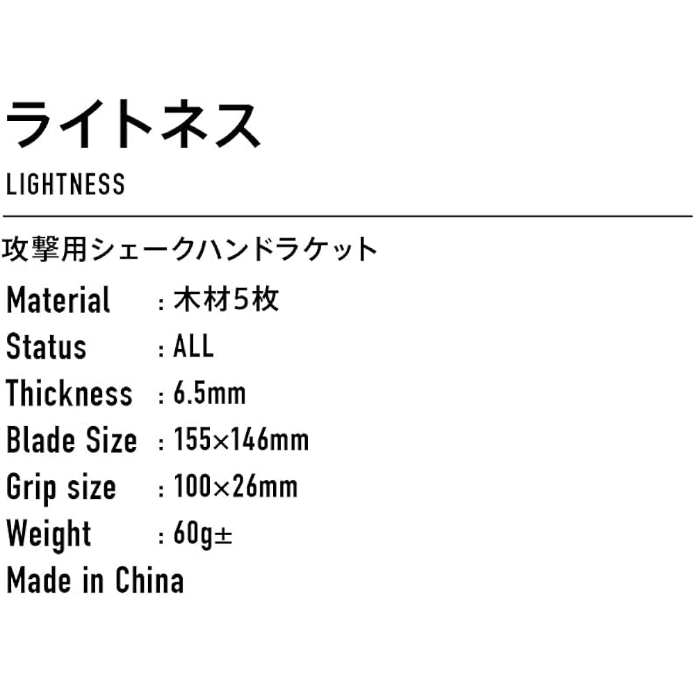 Country of origin: China Material: 5 pieces of wood Specifications: Shakehand racket for attack, shot feel/SOFT, repulsion force/5.5, vibration/7.0 Racket size/length 155 x width 146mm, grip size/length 100 x width 26mm Weight: 60g±
