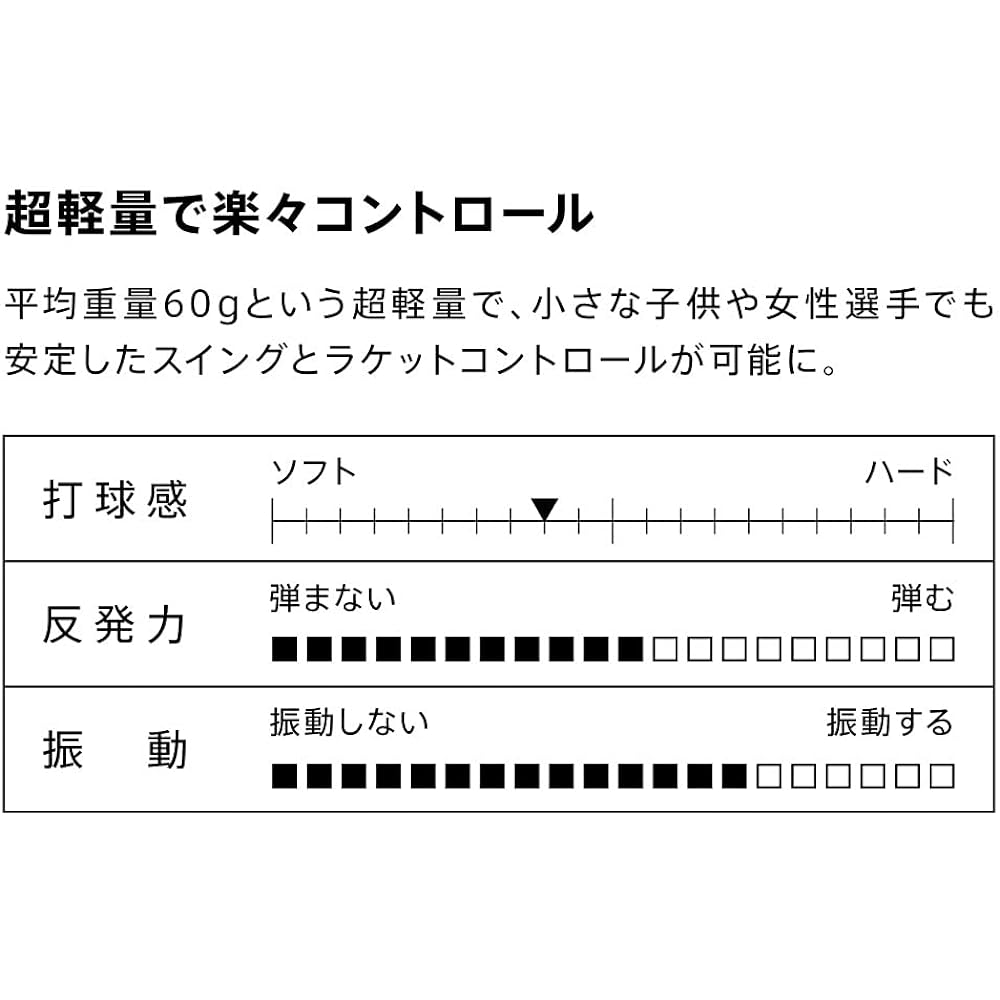 Lightweight Control With an average weight of 60g, even small children and female players can enjoy stable swings and racket control.