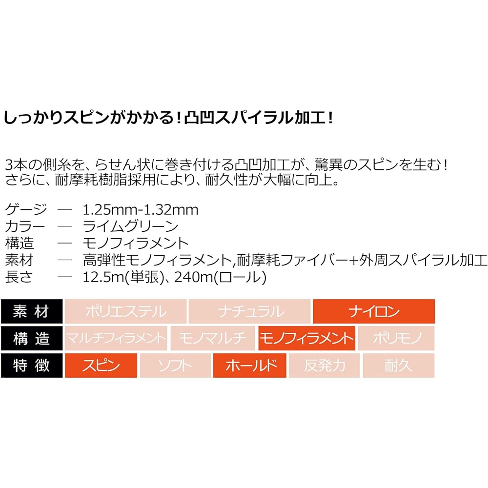 Features ■ Astonishing spin performance with uneven processing! ■The ultimate nylon spin string is born! The uneven process of winding the three side threads in a spiral creates an amazing spin! Furthermore, the use of wear-resistant resin greatly improves durability. The ultimate nylon spin string is born! ■Gut for hard tennis, string for hard tennis ■Nylon gut ■About tension Due to the abrasion-resistant fibers in the middle thread, it feels a little stiffer than regular nylon strings. We recommend lowering the tension by about 2-3 pounds. Country of origin: MADE IN JAPAN