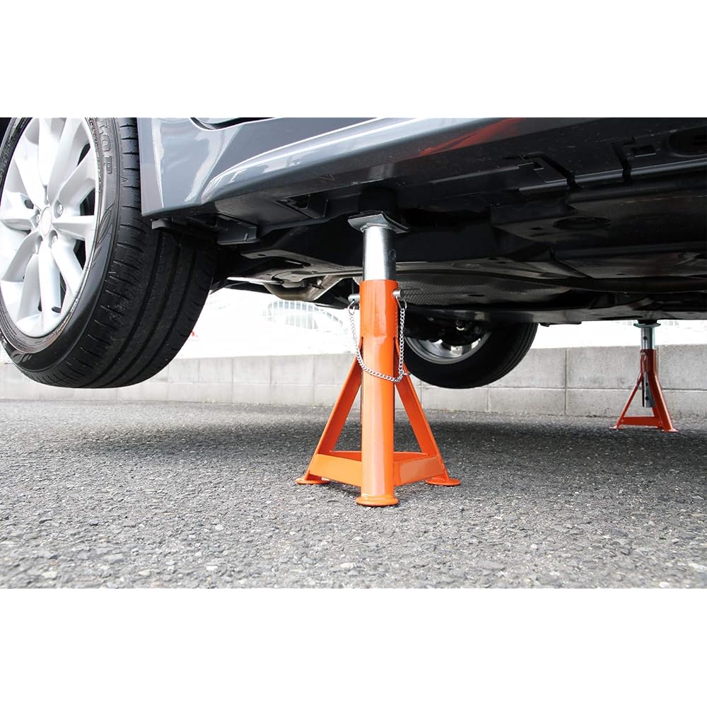 By attaching the separately sold jack-up adapter to the jack-up adapter mounting hole on the saddle, you can hold the vehicle at the jack point for the pantograph jack. Safety Warning [Safety Warning] *When adjusting the height of this product, be sure to adjust the two legs in each set to the same height before starting work. *Do not use on slopes, soft areas, or uneven areas. *Do not use this product under a load that exceeds its capacity. *Do not work with luggage or people on board. *Do not use with the car engine running. *When working, apply the car's handbrake and shift to the [P] parking position ([1] or [R] for manual transmission vehicles). *When holding the product, be sure to use a wheel stopper such as a tire stopper. [Precautions for use] *Do not support the vehicle body at points other than those specified by each automobile manufacturer. *After installing this product in your car, please observe it for about 2 to 5 minutes to ensure that it is safe before starting work. *Before installation, please make sure that there are no deformed or damaged parts on the jack stand body before starting work. *Be sure to insert the safety clip into the stopper bar before use.