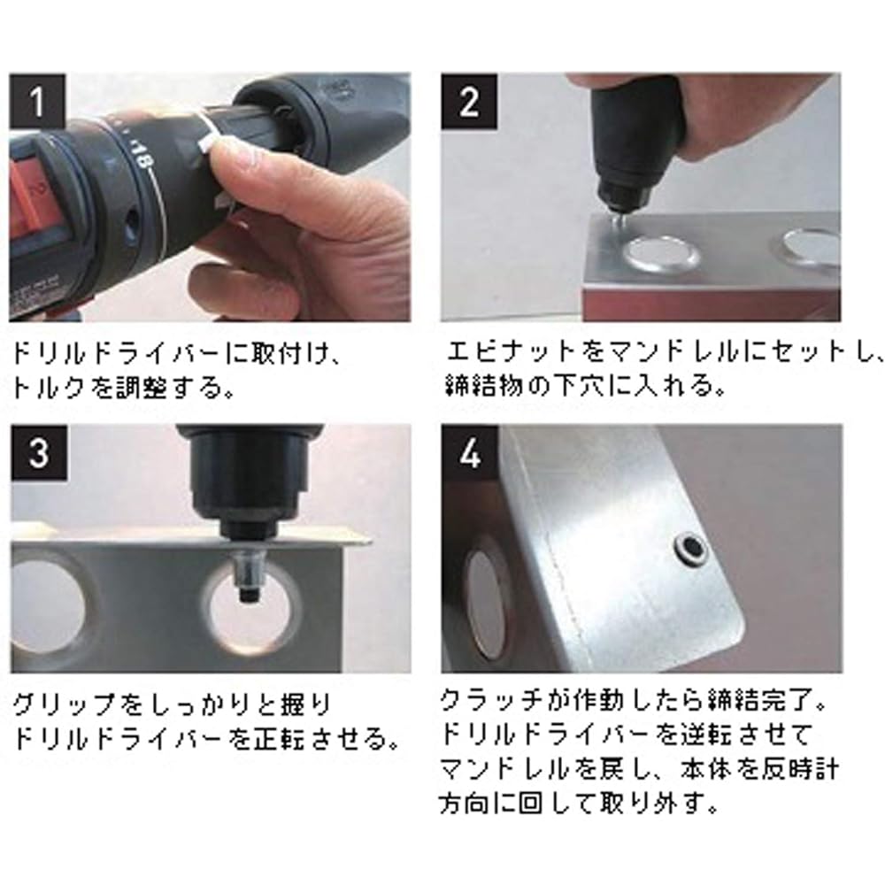 ● Ebi nuts made of all materials (aluminum, steel, stainless steel) can be easily and securely fastened from M4 to M6 without stroke adjustment ● Used by attaching to a commercially available rechargeable drill driver (with torque management function) ● Drill driver torque management A handy type nutter that allows you to install shrimp nuts with just the functions and forward/reverse rotation operations. ●The attachment nutter is exclusively for drill drivers with adjustable torque. Impact drivers cannot be used. ●Torque adjustment range: 6.0N・m or more for steel/stainless steel M6, 4.4N・m drill driver recommended for other sizes