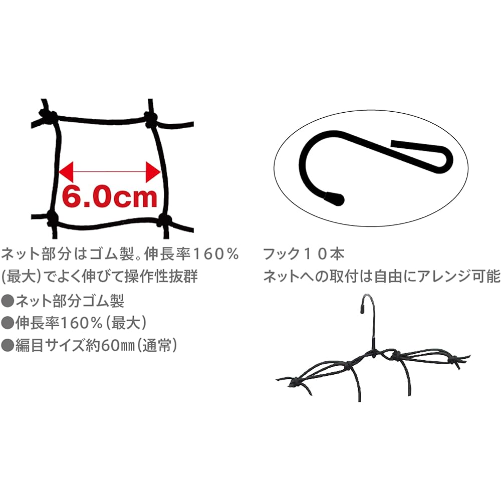 Luggage net for vehicle interior Product number: EA600NT Size: 90cm x 50cm Hooks: 10 pieces Extension rate: 160% (maximum) Mesh size: 6cm