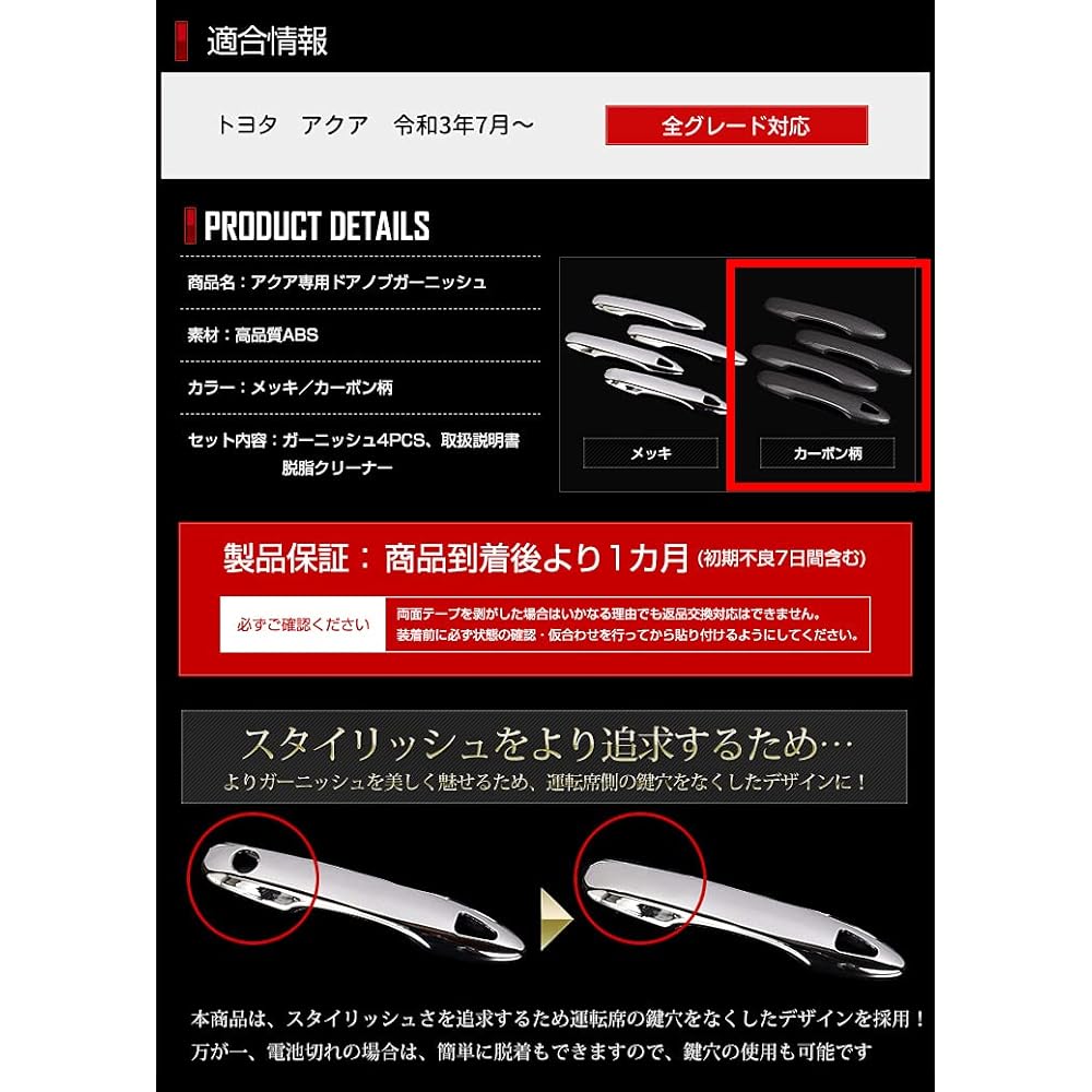 Compatible car model: Toyota Aqua from July 2021 Compatible grades: All grades Accessories: Degreasing cleaner/instruction manual Color: Carbon tone Warranty period: One month from the date of product arrival [including 7 days of initial defects]