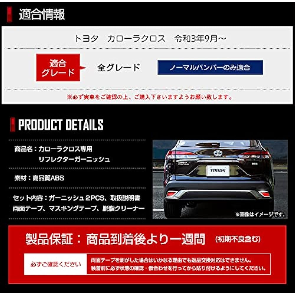 Compatible car model: Toyota Corolla Cross from September 2021 Compatible grades: All grades Material: High quality ABS Set contents: 2 PCS garnish, degreasing cleaner, double-sided tape, masking tape, instruction manual Warranty period: From the time the product arrives One week [including initial defects]