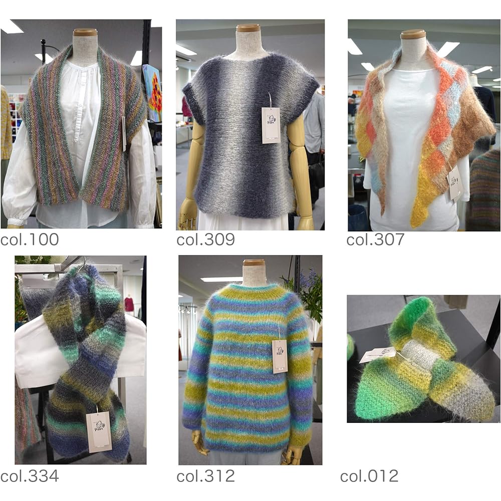 Pena, which means "feather", is said to be the origin of the word pen. The name comes from the beautiful color flow of this thread, which resembles the feathers of a bird. Enjoy a simple knitted fabric that takes advantage of the long pile and expressive yarn. Product number: 67 Thickness: Extra thick Tailoring: 150g Approximately 270m Color/pattern: Col. 334 Blue Materials: 72% mohair, 18% wool, 10% cotton Needles: Bar needles 9-11, crochet needles 9/0-7mm Standard gauge: (needle) 12-13 stitches, 16-17 steps Season of use: Autumn/winter
