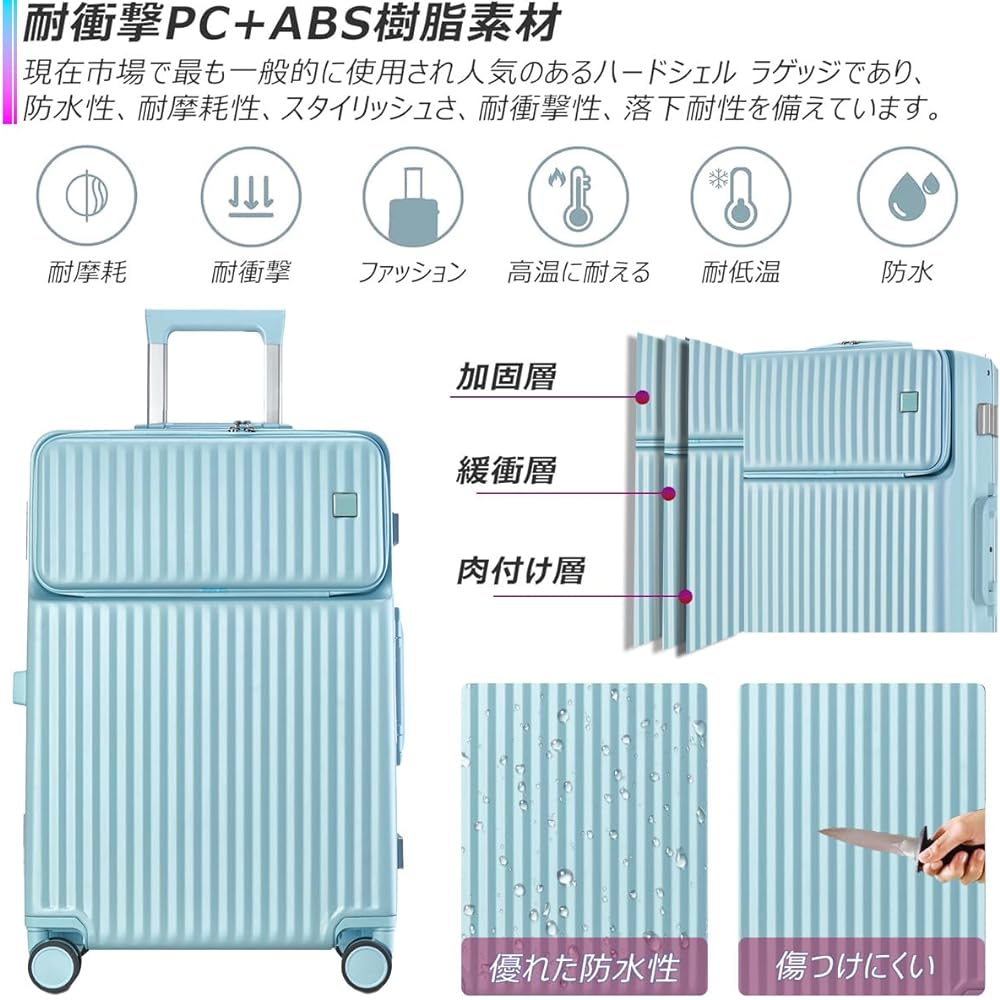 [Brand name]: JOORTI, [Trademark registration number]: 6505416 [Front opening pocket] The front opening pocket design makes it easy to put in and take out. It can store a 16-inch PC, mobile battery, iPad, etc., and is convenient for taking in and out while traveling. You can easily take out what you want from the front pocket even on the Shinkansen or during your trip, and it is also useful in business situations. [TSA double lock 3-stage adjustable carry bar] The travel box is equipped with a world standard facility TSA lock, so you can check it in while it is locked, making your travel safe. There are two dial locks, which can be used in both the main space and the front part, making it more secure. It is also equipped with a carry bar that can be adjusted to 3 stages according to your height and purpose. When adjusting the carry bar to each stage, please lower the carry bar to the bottom once and then adjust the stage by raising it from there. Note: The keyhole on the main body is for inspection by TSA staff, so customers do not receive a key. [All-wheel 360° rotating silent caster] Caster made of rubber material with excellent wear resistance. The silent, durable shock-absorbing ultra-quiet casters rotate 360 degrees freely and come with double casters, which are stable when turning and driving on rough roads, making your trip more comfortable. *The casters can be removed and replaced! [Simple design that can be used in a wide range of situations] A lightweight yet strong suitcase. The simple and cute design can be used by both men and women. The Velcro can be detached and the front panel can be fully opened, making packing easy. It is ultra-lightweight, making it convenient for overseas travel and business trips. [Size] The outer dimensions of the S size are 54.5*35*23cm, weight: 3.2kg. Ultra-light capacity, 42 liters, suitable for 1 to 3 nights. The S size is only applicable to some airlines, so it is better to check with the airline in advance. The inner dimensions of the M size are 60*43*26cm, weight: 3.9kg, capacity is 65 liters, 4 to 7 nights or more. The inner dimensions of the L size are 73*48*30cm, weight: 4.6kg, capacity is 97 liters, for 7 nights or more