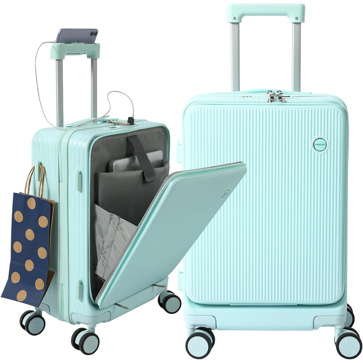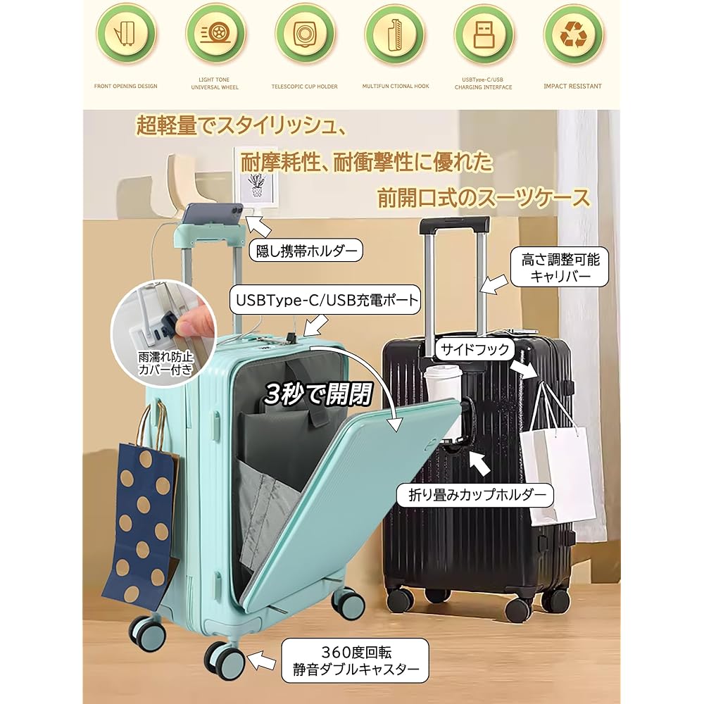 [Product Specifications] A front-opening suitcase that is ultra-lightweight, stylish, wear-resistant, and has excellent impact resistance. The main body is made of high-quality materials such as PC (polycarbonate), which has excellent durability and impact resistance, and ABS resin, which is lightweight, elastic, and crack-resistant. Casters: Made of sound-deadening TPE material, the dual-wheel casters are quiet and durable, allowing for smooth gliding and free rotation of 360 degrees. Caliber: The lightweight and sturdy aluminum caliber can be adjusted in multiple stages to suit your height and usage situation with the push of a button. Equipped with a world standard TSA dial lock. [Multi-functional front open design] We have prepared small pockets to suit your luggage, such as PCs up to 15.6 inches, tablets, books, mobile phones, tickets, etc., making it easy to sort your luggage in the front pocket. You can easily take out what you want from the front pocket on the Shinkansen or while traveling, making it useful in business situations. *Luggage in the main storage area cannot be removed from the front opening. [USB Type-C/USB charging port included] The suitcase has a built-in connector for connecting a mobile battery, and the USB port charging port is located outside, so you can charge it anytime, anywhere. Also, the charging port has a waterproof cover, so you don't have to worry about water droplets forming when you go out on a rainy day. It is attractive because it does not shake, it can be used anywhere, and it is easy to use. [Comes with a foldable cup holder] Comes with a convenient foldable drink holder. Back cup holder, milk tea cup, umbrella can be placed at any time, making your travel more convenient. The non-slip soft handle will keep your hands from getting tired even when you carry it by hand for long periods of time. [Comes with a cell phone holder and hidden hook function] Equipped with a hidden hook, you can hang your bag, etc. to reduce the strain on your hands while traveling. This suitcase has a smartphone holder on top of the pull drive handle so you can place your phone on top. It's very convenient to be able to watch dramas or anime after waiting a long time at a station or airport and placing your phone in the smartphone holder. [Reasonable partition design/large capacity] Made of high quality polyester fabric, soft and comfortable. Thanks to the sealed U-shaped compartment, it won't fall apart when you put your stuff in it. The mesh pocket allows you to see what's inside at a glance. Equipped with an X-shaped belt to prevent luggage from collapsing. It has excellent output and can hold a lot of small items. It's surprisingly light enough that even women can lift it easily, and the interior design is easy to use and can hold plenty of space.