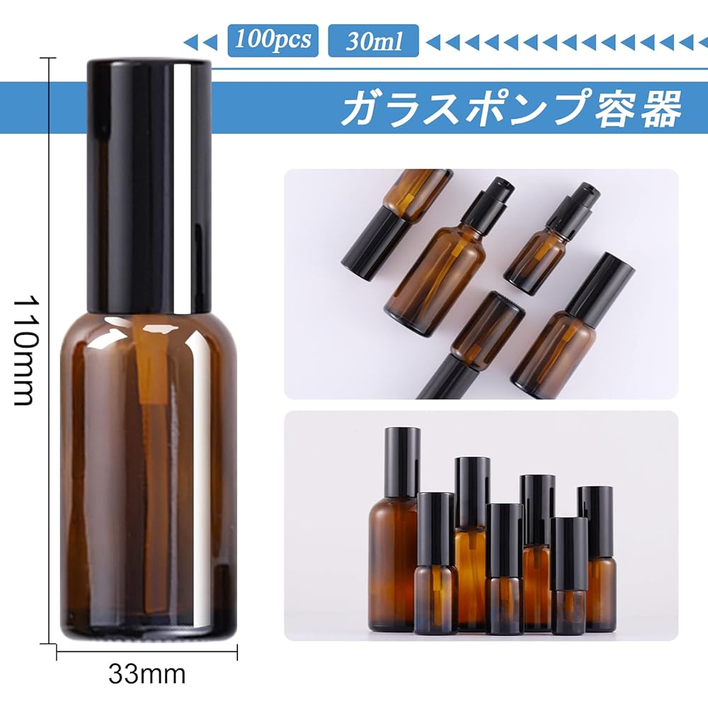Contents: 30ml Number of bottles: Set of 100 Type: Push pump. Height: 110mm, width (diameter): 33mm (Please note when purchasing, all parameters are measured manually, errors are inevitable, please forgive me!) Material: Made of heavy and durable glass, scented locks in and reduces the risk of evaporation. Reusable, environmentally friendly, easy to clean and fill, easy to use. Easy to carry: The empty bottle has a compact design, is lightweight, has a good seal, prevents leakage, is convenient to carry, and can be placed in a bag or pocket. Translucent: The translucent bottle allows you to see the contents at a glance. It is possible to check. A light-tight pump bottle prevents light deterioration and keeps other light-sensitive products safe. Pump bottles help keep bacteria and other contaminants out of your skin care products. Applicable to: A brown light-shielding bottle-type storage container with a convenient pump. Suitable for storing all kinds of liquids, such as essential oils, emulsions, shampoos, lotions, etc. We also recommend household and business travel supplies.