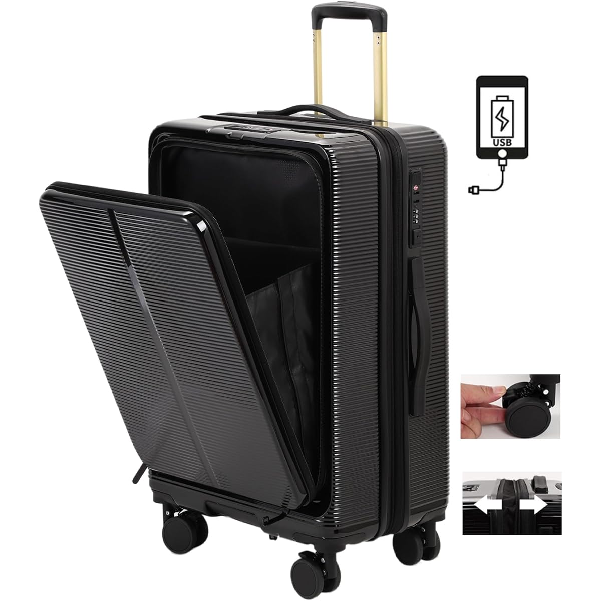 [Yuweijie] Suitcase, Carry Case, Front Open, Extended Function, Carry Bag, Carry-on, Cup Holder, USB Port, TSA Lock, Casters, Stopper, Lightweight, Quiet, Popular, Travel, Business, Business Trip, M Size, 70l-84l, 4 Nights - 6 Nights Black