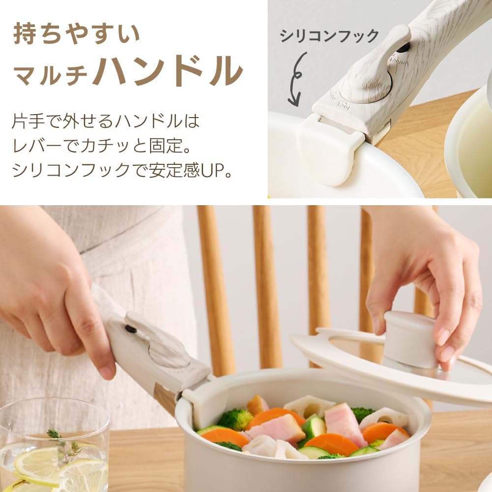 Set contents: Frying pan 20cm, frying pan 26cm, pot 16cm, pot 20cm, egg pan, glass lid 16cm, glass lid 20cm, PE seal lid 16cm, PE seal lid 20cm, multi-handle / Compatible heat source: IH compatible (IH 200V, IH 100V) , gas fire, radiant heater, and other electric heaters (*Cannot be used in microwaves, ovens, or dishwashers.) [Frying pan 20cm/26cm] Surface treatment (inside/outside): Ceramic coating / (excluding the bottom) Baked Paint processing / Material type: [Body] Aluminum alloy [Beam bottom] Stainless steel (16% chromium) [Bottom thickness] 2.5mm (beam bottom included) / Dimensions: 20cm/26cm / Full water capacity: 1.1L/2.7 L [Pan 16cm/20cm] Surface treatment (inside/outside): Ceramic painting / (excluding bottom) Baked painting / Material type: [Body] Aluminum alloy [Beam bottom] Stainless steel (16% chrome) [Bottom Thickness] 2.5mm (including the bottom of the beam) / Dimensions: 16cm/20cm / Full water capacity: 1.5L/2.8L [Egg bread] Surface treatment (inside/outside): Ceramic coating / (excluding the bottom) Baked coating / Material type: [Body] Aluminum alloy [Beam bottom] Stainless steel (16% chromium) [Bottom thickness] 5.0 mm (including beam bottom) / Dimensions: Approx. 23.5 x 15 cm / Full water capacity: 1.3 L [Glass lid 16 cm] /20cm] Product name: Tempered glass appliance / Type of reinforcement: Front physical reinforcement / Rubber part: Silicone resin (heat resistant temperature approx. 220℃) / Dimensions: 16cm/20cm [PE seal lid 16cm/20cm] Raw resin: Polyethylene (heat resistant) Temperature approx. 80°C) / Dimensions: 16cm/20cm [Multi-handle] Material: [Resin part (top/bottom)] Nylon (heat resistant temperature 150°C) / Phenolic resin (heat resistant temperature 150°C) [Metal part] Stainless steel [Rubber part ] Silicone resin (heat resistant temperature approx. 220°C) *Please use at medium heat or lower and with oil on the cooking surface. / *Avoid rapid cooling after cooking. / *As this is a metal cookware, it cannot be used in the microwave. / *Do not wash or dry in a dishwasher.