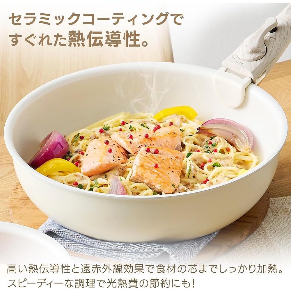 [Ceramic Color Pan: 10-piece set] Comes with a removable handle. The ingredients don't stick together easily, and you can even fry fried eggs. Compatible with both IH and gas fires. ◆Cooking surface abrasion resistance test passed 500,000 times (*) Comfortable feel that lasts. (*Based on a test conducted using our measurement method based on JIS S 2010 8.3.4.5 Abrasion Resistance Test.) ◆Ceramic coating is resistant to abrasion and easily removes dirt. Easy to clean. ◆Removable handle A multi-handle that can be easily removed with one hand and stored neatly. You can also remove the handle and use it as a plate for your dining table. ●Country of origin: China