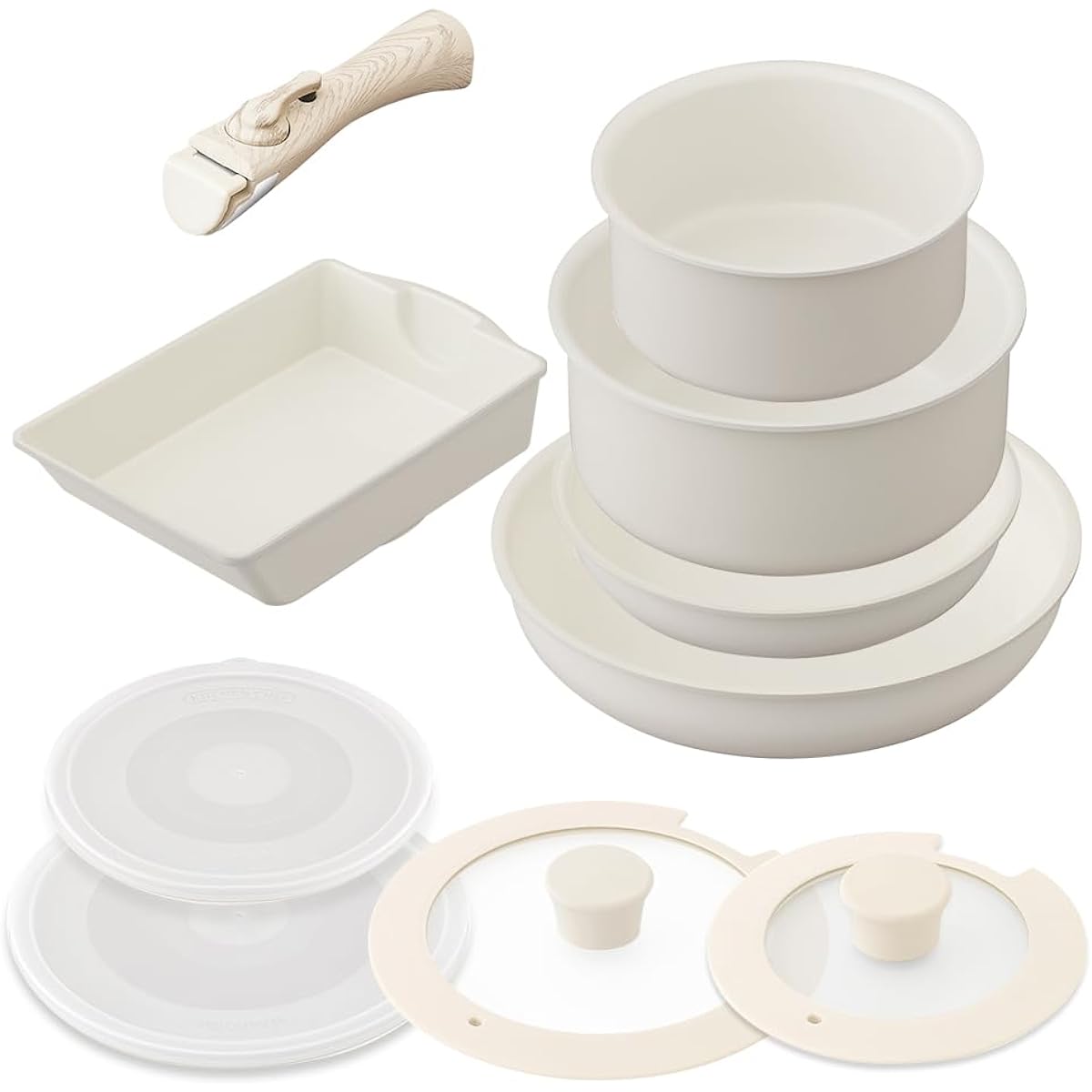 Iris Ohyama Frying Pan Set Compatible with IH & Gas Fires, 10-Piece Set, Frying Pan with Removable Handle, Ceramic Color Pan, Heat Conductive for Quick Cooking, Shorter Cooking Time, Fluffy and Juicy Greige CC-10S