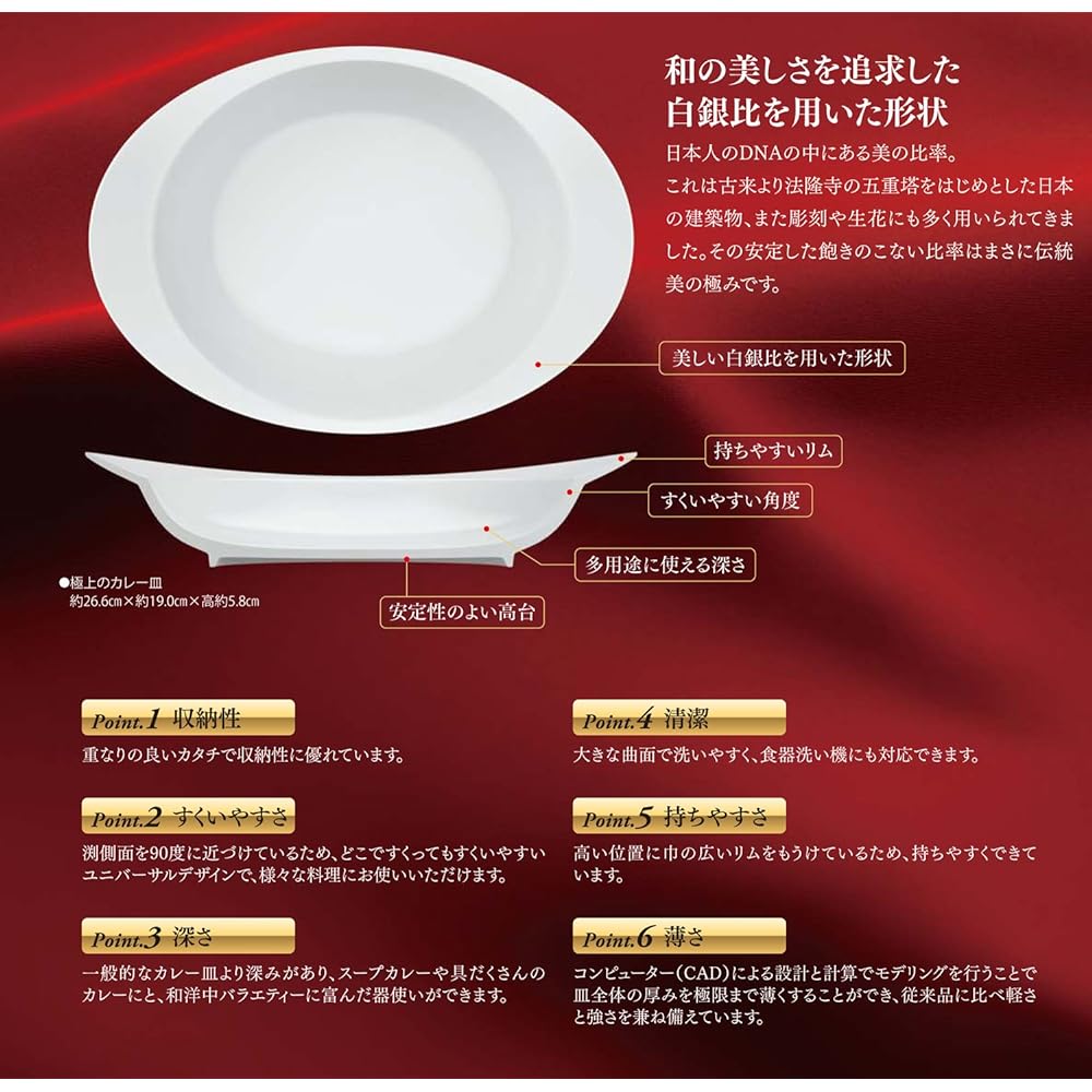 ● "Excellent curry plate" for people who are particular about curry ● We developed a product that satisfies customers by prototyping and tasting the opinions of chefs at specialty stores, food coordinators, and people who are particular about curry ● Can be used in the microwave ● Good overlap Excellent storage due to its shape ●Design that makes it easy to scoop with the edge side close to 90 degrees ●Large curved surface makes it easy to wash ●Easy to hold rim design ●Computer design makes it thin and light! Same strength