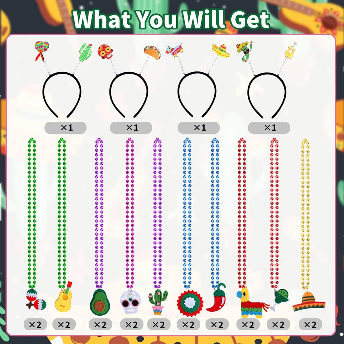 Atonofun 24 Pieces Cinco De Mayo Fiesta Accessories Mexican Headband and Necklace Set Fiesta Hair Hoop Fiesta Beads Necklace Costume Accessories for Mexican Themed Fiesta Carnival Party Favors