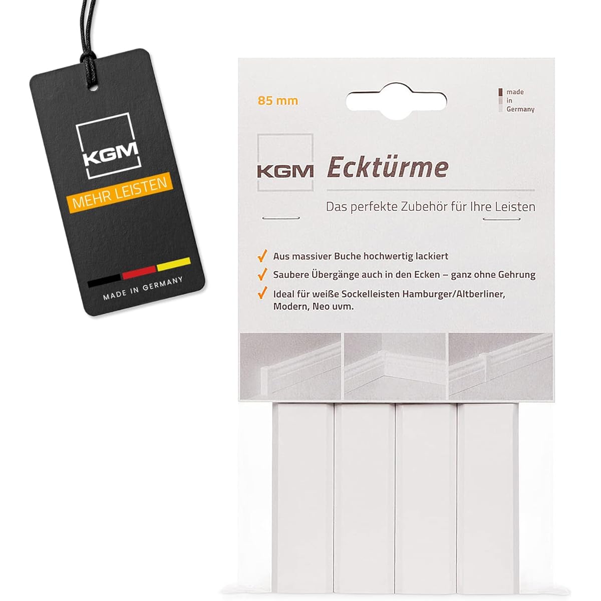 KGM corner blocks are perfect for inside and outside corners. It can also be used as a connector to elegantly replace miter cuts and transitions between skirtboards. Easy to assemble: Corner blocks are attached with wood glue and can be shortened to the appropriate height and painted. Our high quality baseboards are PEFC certified and come from managed forest management / All paints used are solvent free and low odor [Founded in 1973] As a family-run company, Combining tradition and innovation, KGM produces individual high-quality wooden skirts and practical accessories. Scope of delivery: 4 KGM baseboard corner blocks