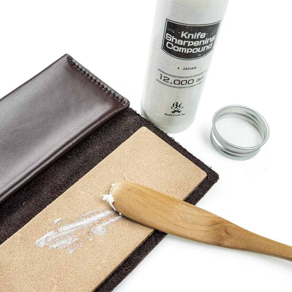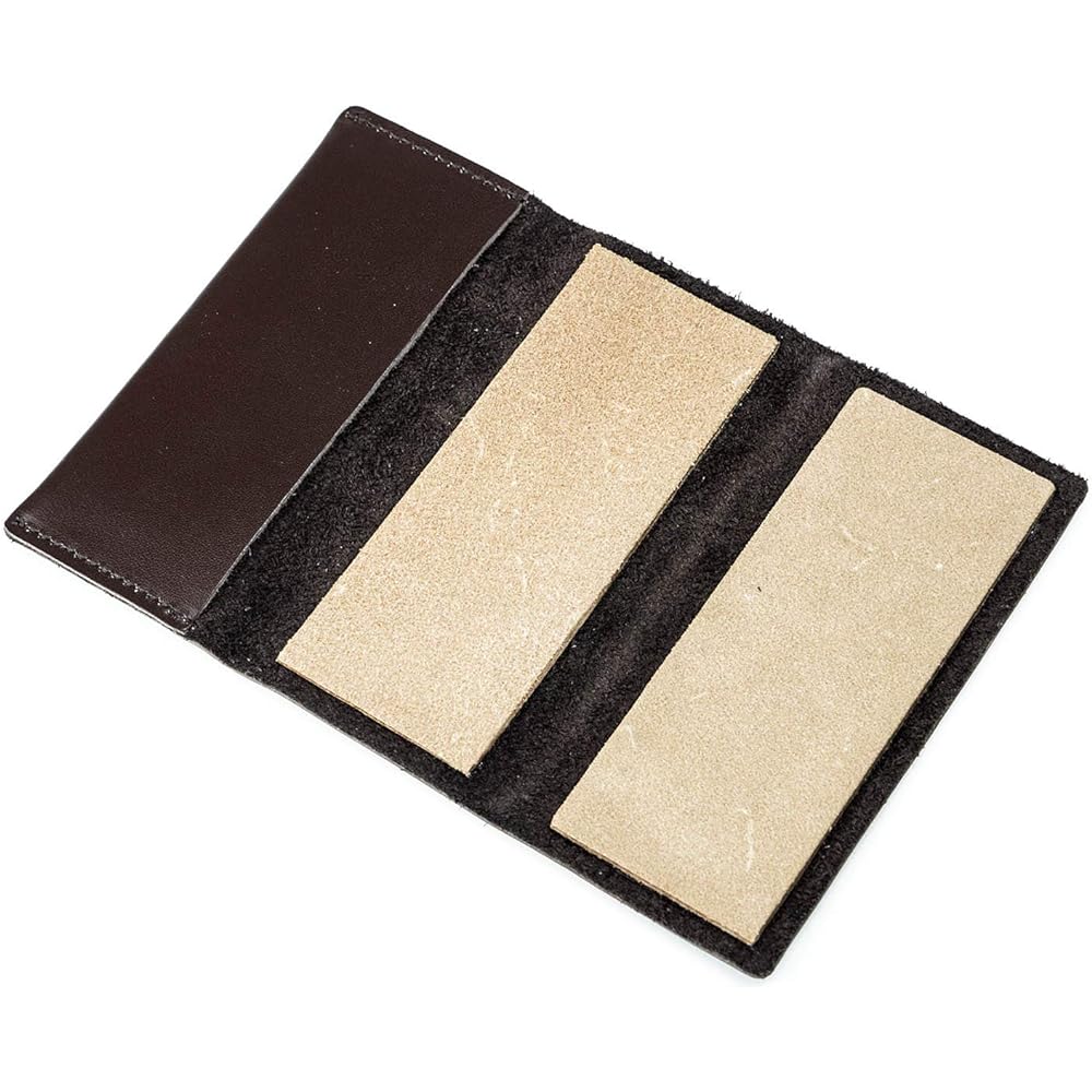 A palm-sized portable leather strop. We can temporarily restore the sharpness of a knife that has been used outdoors and has lost its sharpness on the spot. By applying the compound to the skin-colored leather surface in advance and sliding the knife over it in a motion similar to spreading butter on bread, a uniformly sharp blade is created. [Points and precautions when using] - Please use the resin plate in the pocket as an underlay when stropping.・It is also possible to store portable whetstones such as Falkniven's CC4 and DC4 instead of the resin board.・It is convenient to store the leather with the logo facing outward so that the compound-coated leather polishing surfaces do not come into contact with each other. - You can create a very sharp and polished cutting edge by quickly applying the strop to the finish of any knife other than a convex grind edge.・It is convenient to write down the particle size of the compound applied to the leather polishing surface with an oil-based pen, etc. in advance.