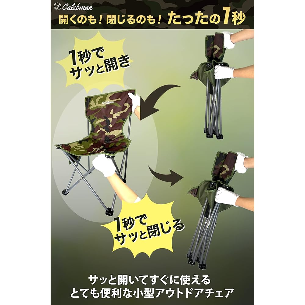 [Outdoor chair that can be opened and closed in 1 second] A very convenient outdoor chair that can be opened and used immediately. It can be used for a wide range of purposes, from outdoor activities such as camping, fishing, mountain climbing, and BBQ, to sports days, parks, picnics, leisure activities, and waiting in line. Comes with its own storage bag, so you can easily carry it around. [Weight Capacity 150kg/600D Oxford Material] Weight capacity is a whopping 150kg. It's sturdy enough for a large man to sit on, so it can be used by your family and friends. The seat fabric is 600D Oxford, which is also used for parachutes. This material is ideal for outdoor use as it has excellent water repellency, abrasion resistance, and breathability. [Improved here! Added strength and reinforcement with 4 legs] Improved from the usual 3 legs to 4 legs. ① Since the weight is distributed, stability when sitting has been greatly increased. ②The disadvantage that it tends to spread when the weight of three legs is applied has been improved by making it four legs. ③ A hinge was added to strengthen the connection between the cloth and the legs. ④We installed parts that can be supported by a surface instead of a point for the leg landing surface. The chair can be used even on the ground without sinking. ④ Convenient pockets allow you to store various items such as fishing supplies, notebooks, cell phones, etc. [Planned by a Japanese company] The Calebman outdoor chair was planned and born in Japan. We are planning products that will make your outdoor life more convenient and enjoyable. The product comes with a 100-day warranty from the date of purchase. If you have any questions, our Japanese staff will be happy to assist you. [Product specifications] ○Color: Black and white camouflage, green camouflage, plain black ○Size: Length 42cm x Width 42cm x Height 72cm ○Weight: 1.3kg ○Weight resistance 150kg ○Material: Steel, 600D Oxford fabric ○Set contents: Backrest included Outdoor chair, storage bag ○Applications: Camping, fishing, mountain climbing, BBQ, beach, excursions, parks, theme parks, balconies, gardening, waiting in line, etc. ○Brand: Calebman <100-day warranty for peace of mind>