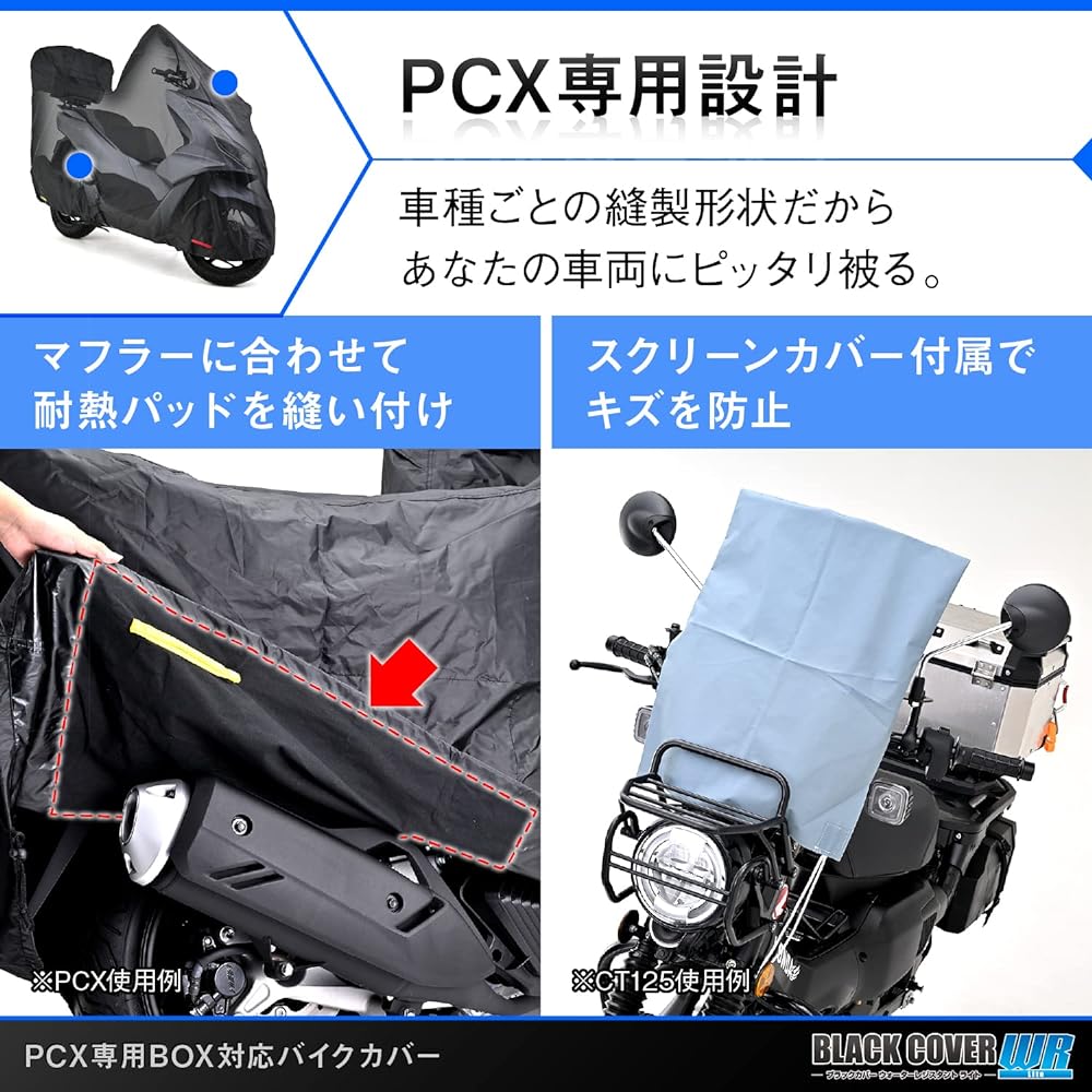 Exclusively for PCX Box Bike cover (with screen cover) that matches the handlebar lock state Made of fabric with a water pressure resistance of 20,000mm, which is 10 to 20 times more water resistant than regular bike covers. Seams are treated to stop water from entering, and air ventilation improves breathability. Exhausts trapped moisture from the left and right mirrors. One-touch belt and front and rear aperture straps are used at the bottom center of the vehicle to prevent wind. Heat-resistant pads are sewn to match the muffler position.