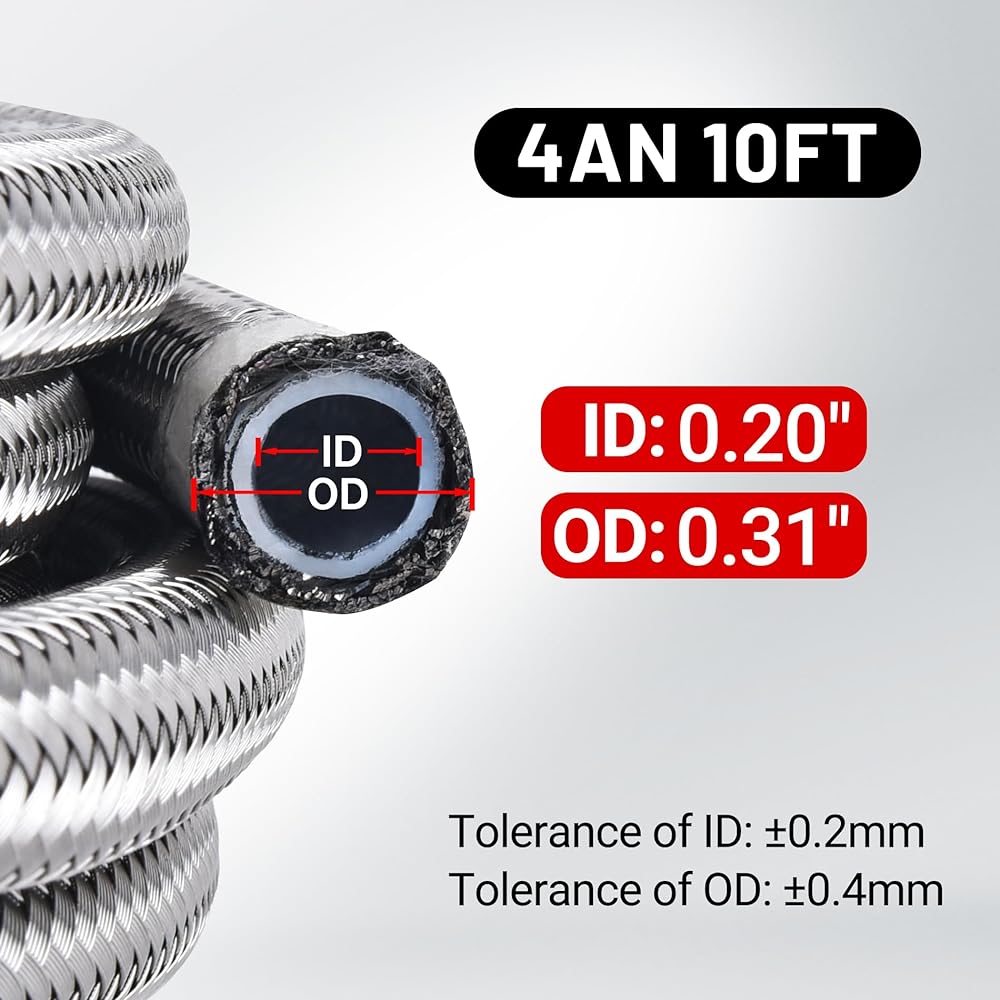 ID: 3/16 inch. Outer diameter: 0.31 inch Length: 10 feet. Please measure your size before purchasing. (Includes: See pictures). Operating temperature range: -60℃~230℃ Maximum operating pressure: 4000psi. Bursting pressure: 12000psi. 4AN PTFE stainless steel braided fuel line is ideal for high temperature and high pressure applications. Applicable media: All automotive fuels, lubricants, and coolants. PTFE hoses are relatively stiff and cannot be bent or snapped in half. Professional installation is highly recommended.