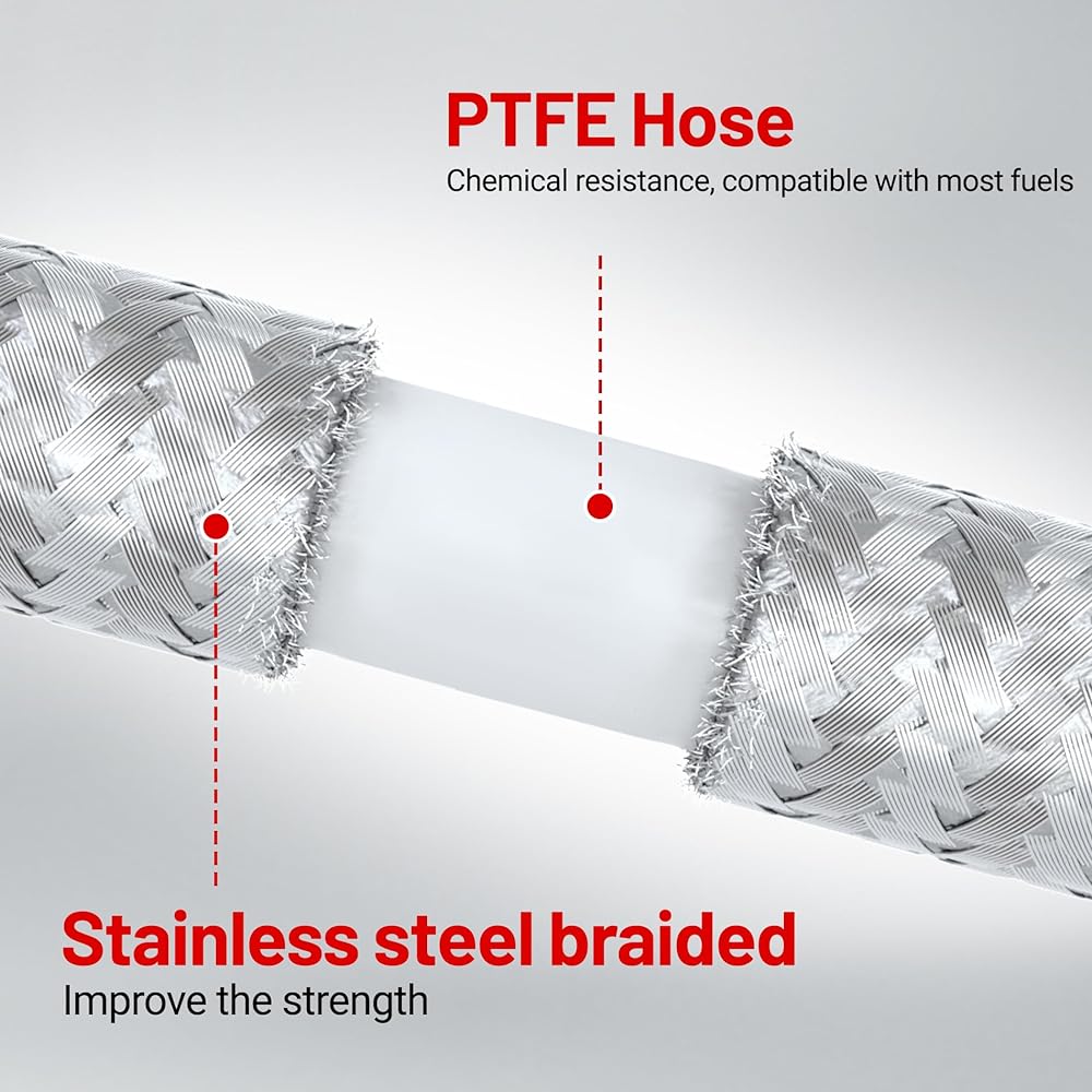 "EVIL ENERGY is our brand. We are a direct and professional manufacturer. We are the best manufacturer of tuning parts, including intake systems, exhaust systems, engine systems, cooling systems, interior & exterior parts. EVIL ENERGY PTFE Stainless Steel Braided Fuel Hose is made of stainless steel and PTFE. Excellent corrosion resistance and chemical resistance. Gas, E85, Ethanol, Diesel, Transmission Fluid, Brake Fluid, Power Steering Withstands all types of liquids and chemicals, including fluids, antifreeze, etc. Kit includes straight, 45 degree and 90 degree PTFE hose end fittings and hose separator clamps. Ideal for high temperature and high pressure applications. br>