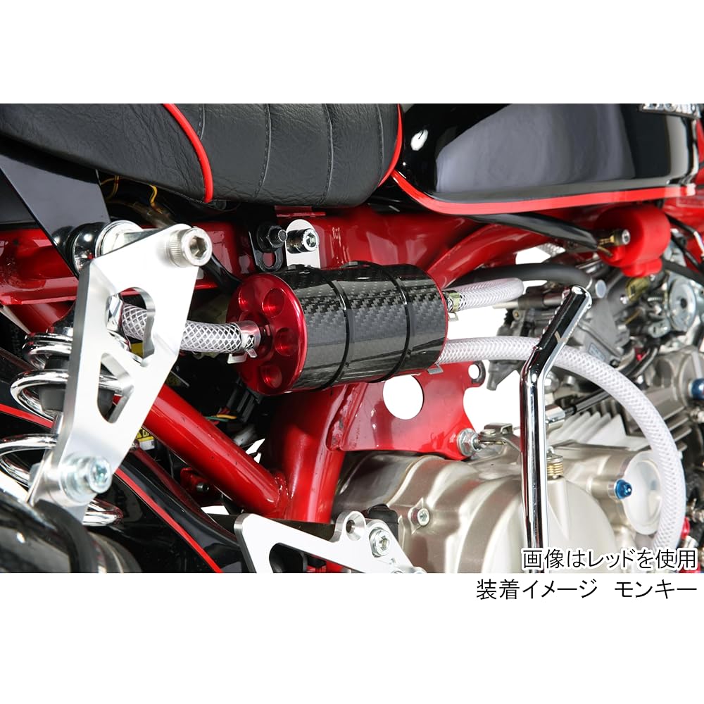 The pressure inside the case that obstructs piston movement is removed from the cylinder tappet and case breather, reducing power loss and temperature rise inside the crankcase. At the same time, the catch tank reliably catches the oil that blows out, releases only the pressure to the atmosphere, and returns the oil to the filler cap.This is a standard tuning part for 4-stroke engines. *Standard muffler and up type muffler cannot be installed. Only for vehicles equipped with down type muffler. *Since the main body is attached with a tie wrap, it can be used on various monkey engine cars depending on where it is attached. ■Compatible models Monkey/Gorilla/Monkey Baja: FNO, Z50J-1000001~/FNO, AB27-1000001~1899999■Specifications〇Catch tank bottle: Aluminum carbon wrap〇Bottle cap: Machined aluminum/anodized finish〇Outer diameter x bottle Length: φ63×115mm〇Capacity: 220cc